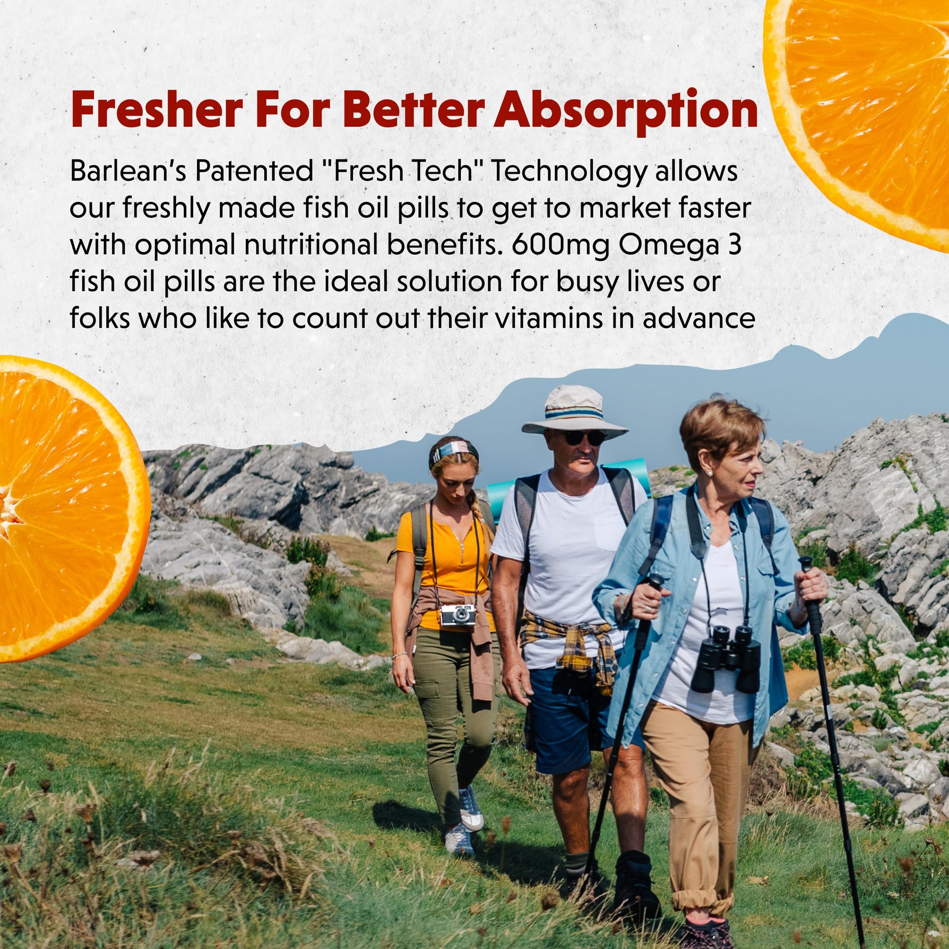 Barlean's Omega 3 Fish Oil Supplements, Supplement Softgels for Men and Women, 600mg EPA and DHA Fatty Acids, Orange Flavored, 100 Count