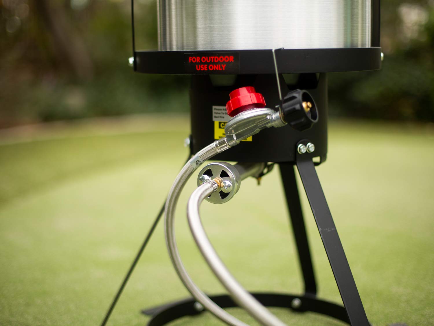 • Package Content - 30 qt. Pot, Steamer Basket, Burner Stand, LP Hose & Regulator, Temperature Thermometer, Poultry Rack, Marinade Injector