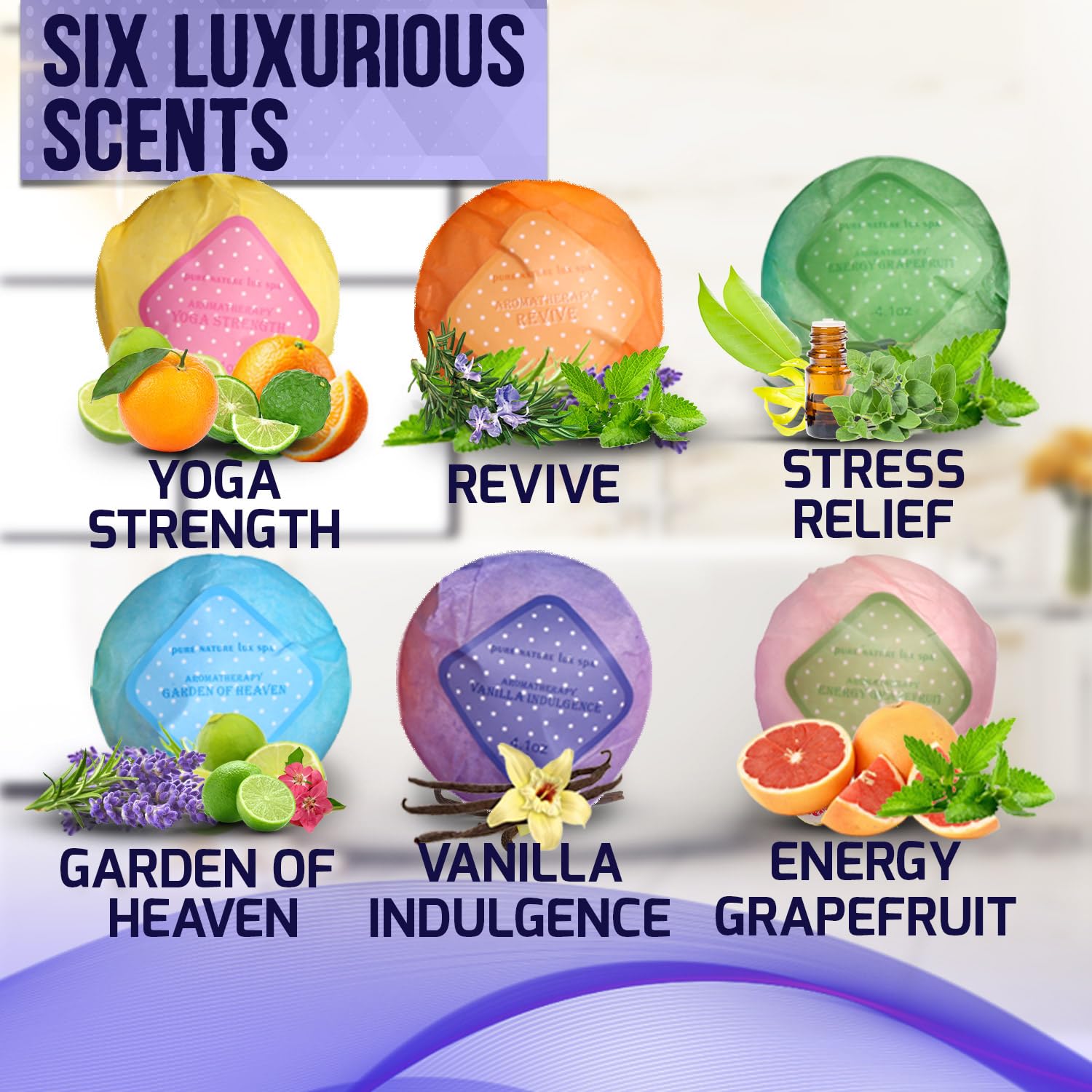 • SIX SCENTS: This bath bomb gift set features six different aromas to help you both relax and recharge; Featuring a blend of ylang ylang, lavender and marjoram to help reduce stress as well as uplifting combinations like citrus and bergamot for invigoration, Pure Nature Lux Spa’s bath products are the obvious choice for people who like to indulge in luxury