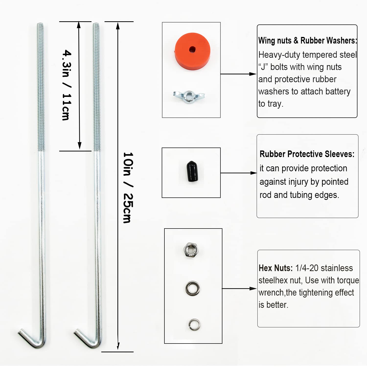 • 【Battery Hold Down Kit 】Includes 1x battery hold down bracket, 2x10in J-bolts, 2 sets of accessories (for different mounting styles) - 2x hex nuts and wing nuts, 2x rubber protective sleeves, 2x protective rubber washers, 2x spring lock washers, 2x flat washers. Easy to install and provides stable support for the battery