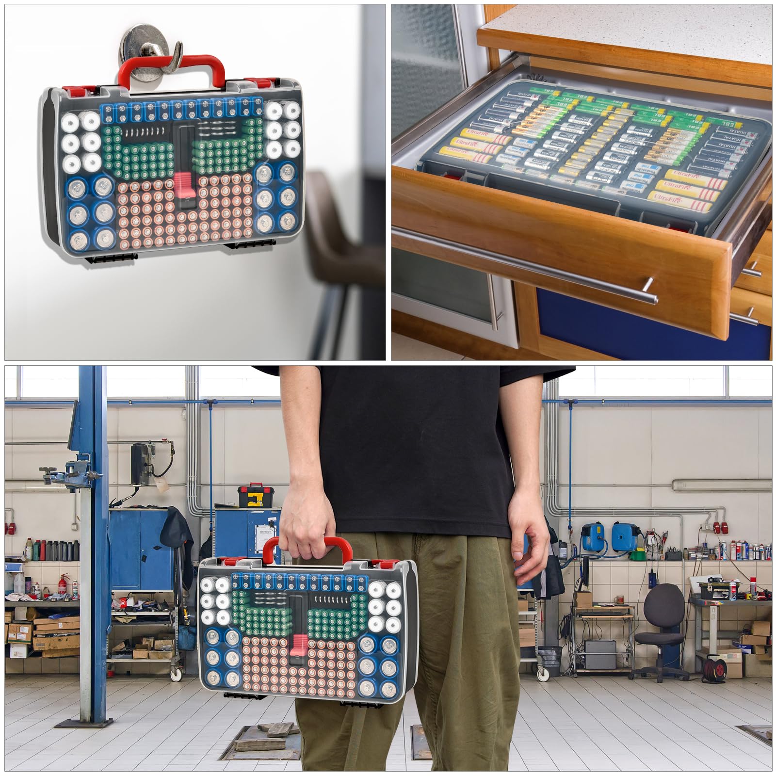• Garage Organization for aaa aa batteries: Battery organizer for drawer with sturdy and comfortable handle, you can easily carry it and go out. Battery carrier with compact size and humanized bottom design allow you to put cr2032 battery protector into the drawer, tool room, workbench, garage cabinets or stand it on the table, shelf or storage rack easily and directly