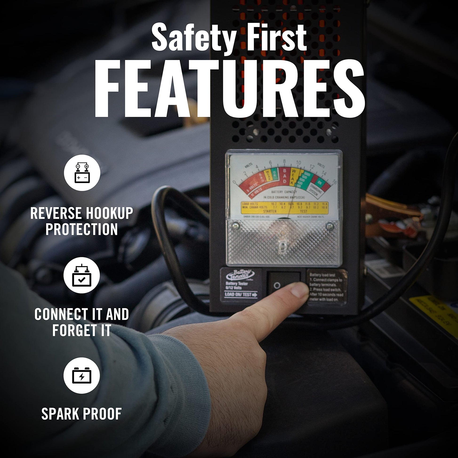 • SAFETY FEATURES: Rubber insulated carrying handle and color-coded heavy duty alligator clamps to ensure user safety and reliability. Color coded display to quickly identify battery tester results.