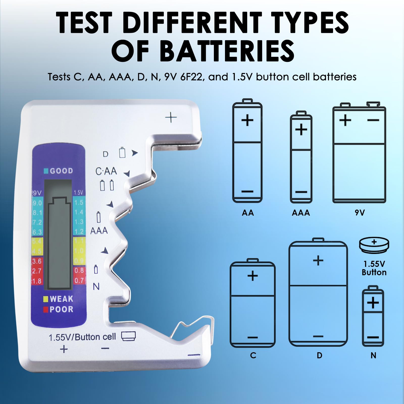 • TESTING DIFFERENT TYPES OF BATTERIES: Digital Universal Battery Tester It works with standard and rechargeable household batteries C, AA, AAA, D, N, 9V 6F22.6F22,also good for checking a wide variety of button cell batteries,The Battery Tester have High Compatibility