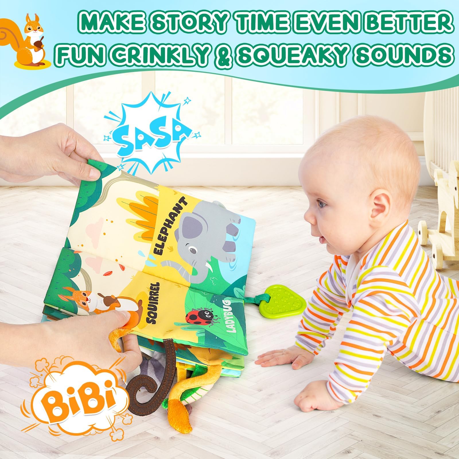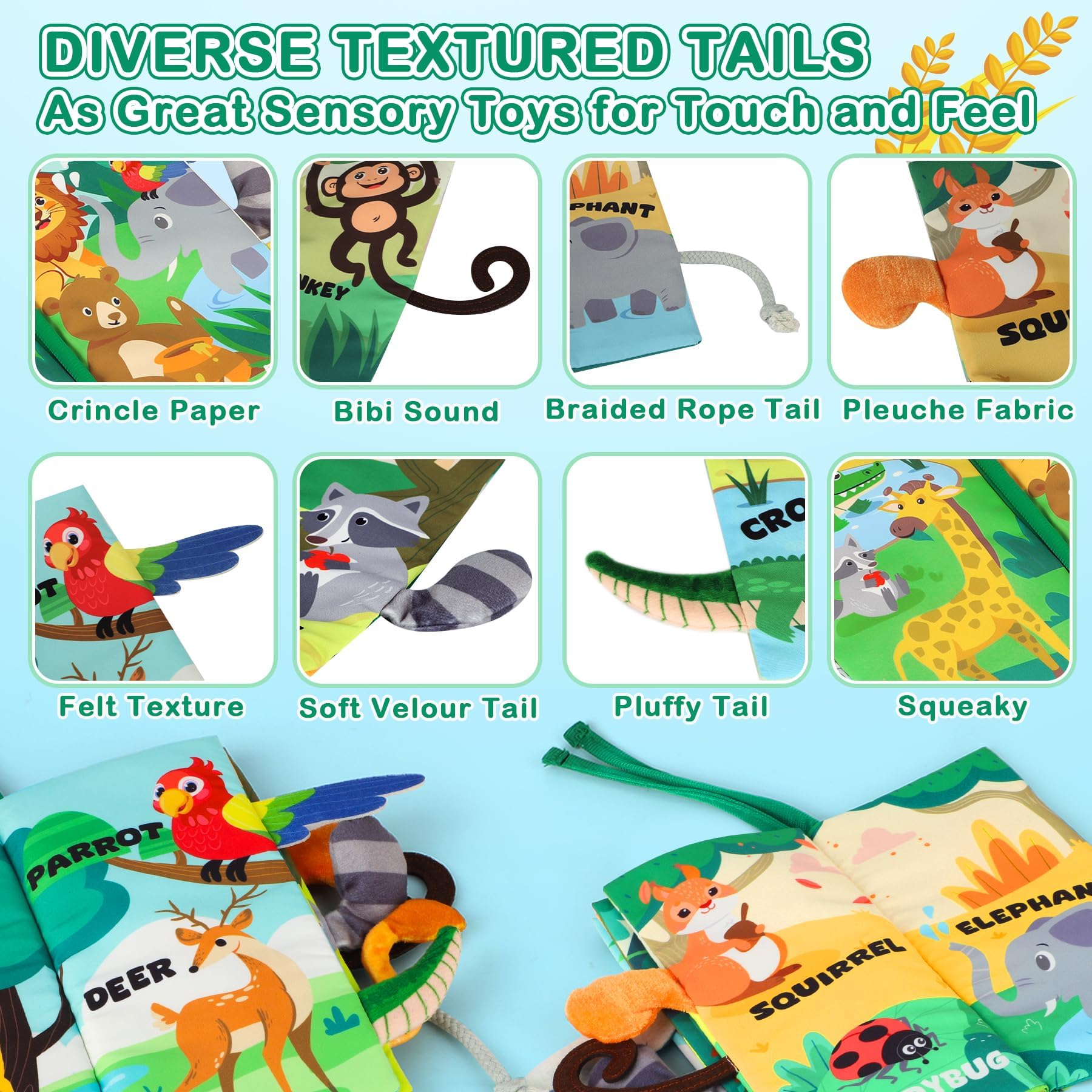 • Bright Colors and Engaging Sounds: Our early learning books are perfect for baby boys and girls. The vibrant colors catch your baby's eye, while the crinkle feature and squeaker sound improve audio recognition and motor skills. Textured animal tails provide sensory interaction, keeping your little one engaged for hours of fun.