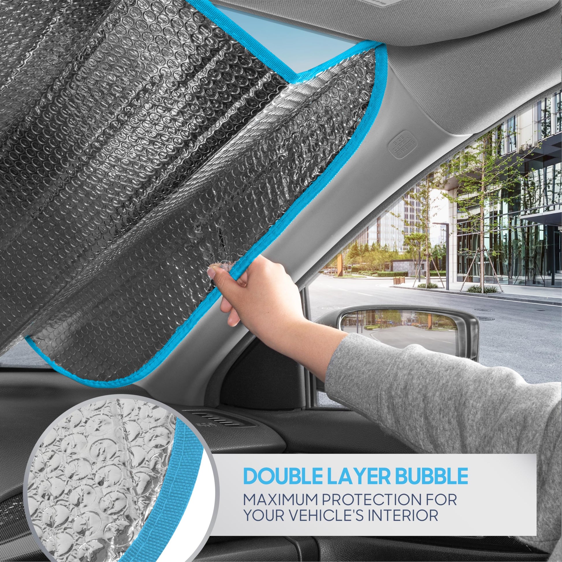 • 100% UV PROTECTION: Dual-Layer Bubble car windshield sun shade design for maximum protection for your vehicle's interior, this sun shade for car windshield will keep your seats and steering wheel cool by blocking the sun's heat and harmful UV radiation rays.