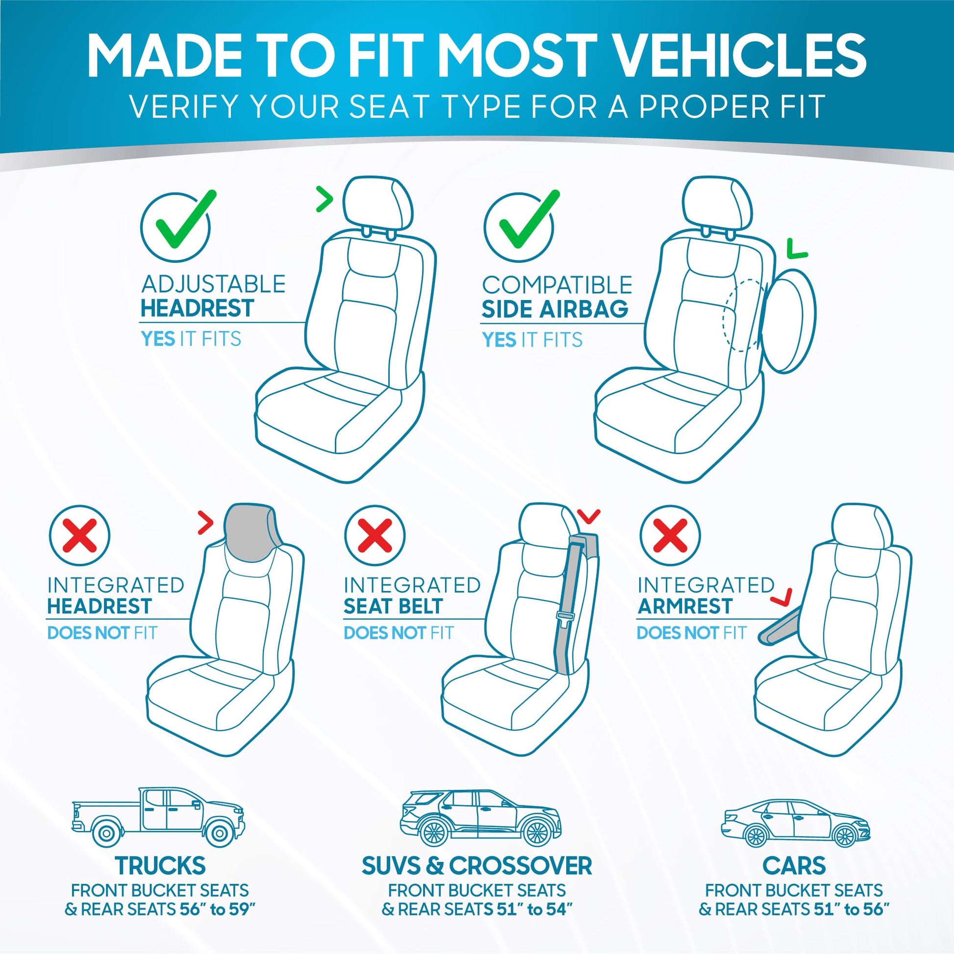 • UNIVERSAL FIT FOR MOST AUTOS: Our seat covers are designed to provide a snug and stylish fit for the majority of cars, trucks, vans, and SUVs. They are compatible with most vehicles that feature adjustable or removable headrests. Please note: these seat covers are not compatible with seats that have molded (non-adjustable) headrests, integrated seatbelts, or built-in armrests on the front seats.