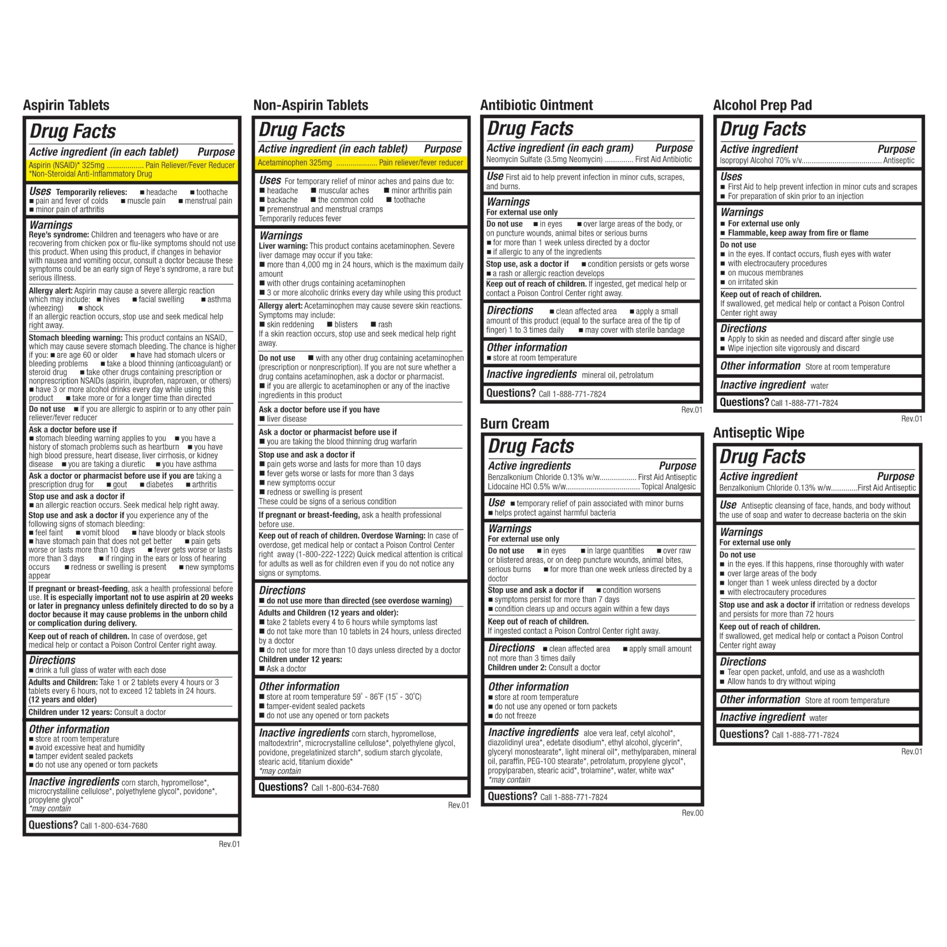 - TREAT - • 10 Antibiotic ointment packets • 2 Burn cream packets • 1 Instant Cold Compress 5 in x 6 in [12.70 cm x 15.24 cm] • 4 Non aspirin tablets • 6 Aspirin tablets
