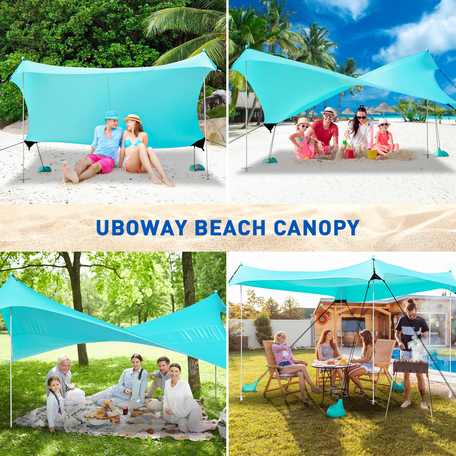 • 【Enhanced Stability and Durability】Uboway beach canopy is equipped with 8 upgraded sandbags, 4 thickened aluminum poles, and unique 4 large pole anchors for sand and grass. In addition to this,our canopy is connected with high-quality nylon rope to the sandbags, making it more stable and long-lasting use than other beach tents.
