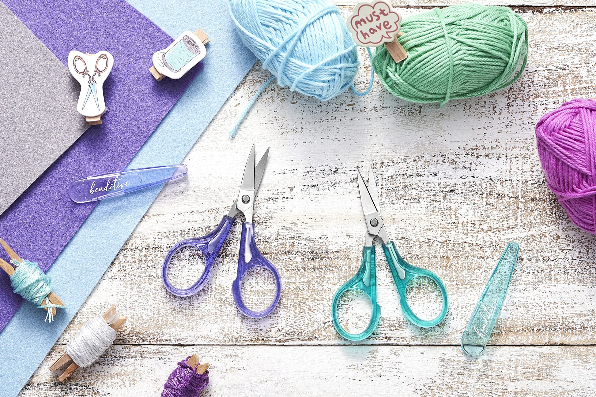 • Multipurpose Craft Scissors Set – This unique kit includes purple-handled scissors with a curved tip for embroidery and sewing, as well as green-handled scissors ideal for fine details and general DIY use.