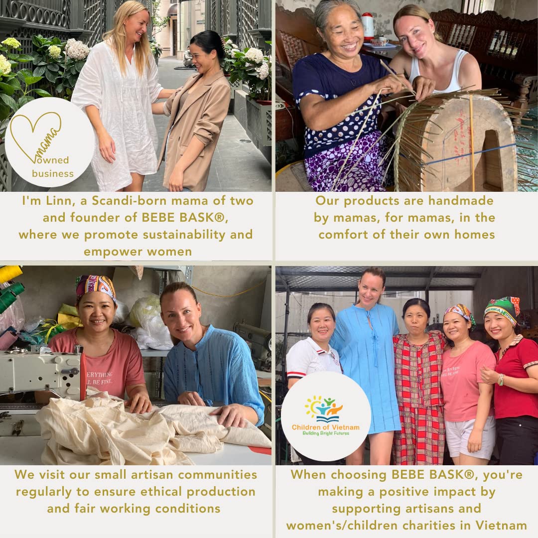 • 100% HANDCRAFTED BY MAMAS FOR MAMAS: Skilled artisan mamas lovingly handcraft each piece in the comfort of their homes, using traditional techniques passed down through generations. By choosing BEBE BASK, you're supporting local Vietnamese artisan mamas and their families, creating a sustainable income, and preserving the fine art of craftsmanship