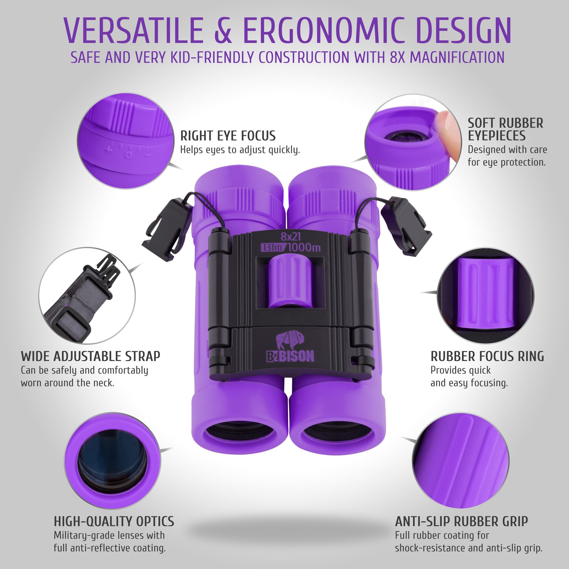 • CHILD’S SAFETY FIRST: BeBison's set of kids binoculars propose safety features and the metal mount gives more durability that will help your child see the wonders for a long time. Rubber exterior and soft rubber eyepieces help to protect the eyes from impact and in general from injuries and moisture, being also drop-proof and shockproof. Clearly calibrated images don't tire the eyes, wide neck strap prevents harm to the child when used
