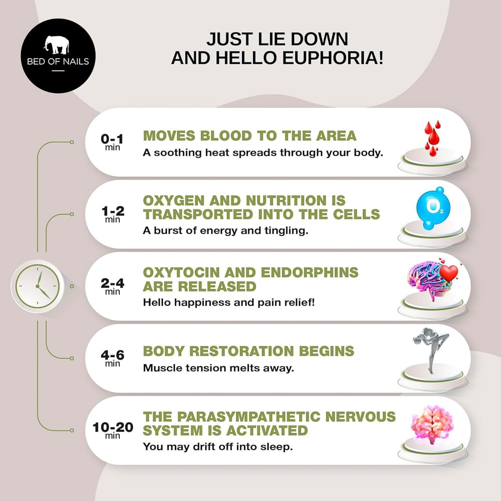 • BED OF NAILS BENEFITS: Our acupuncture mat does not penetrate the skin, but instead supports relaxation, meditation, deep sleep, stress, muscle tension, upper and lower back pain, plantar fasciitis, and more, as the body restores natural vitality, making this a great addition to your beauty tools arsenal