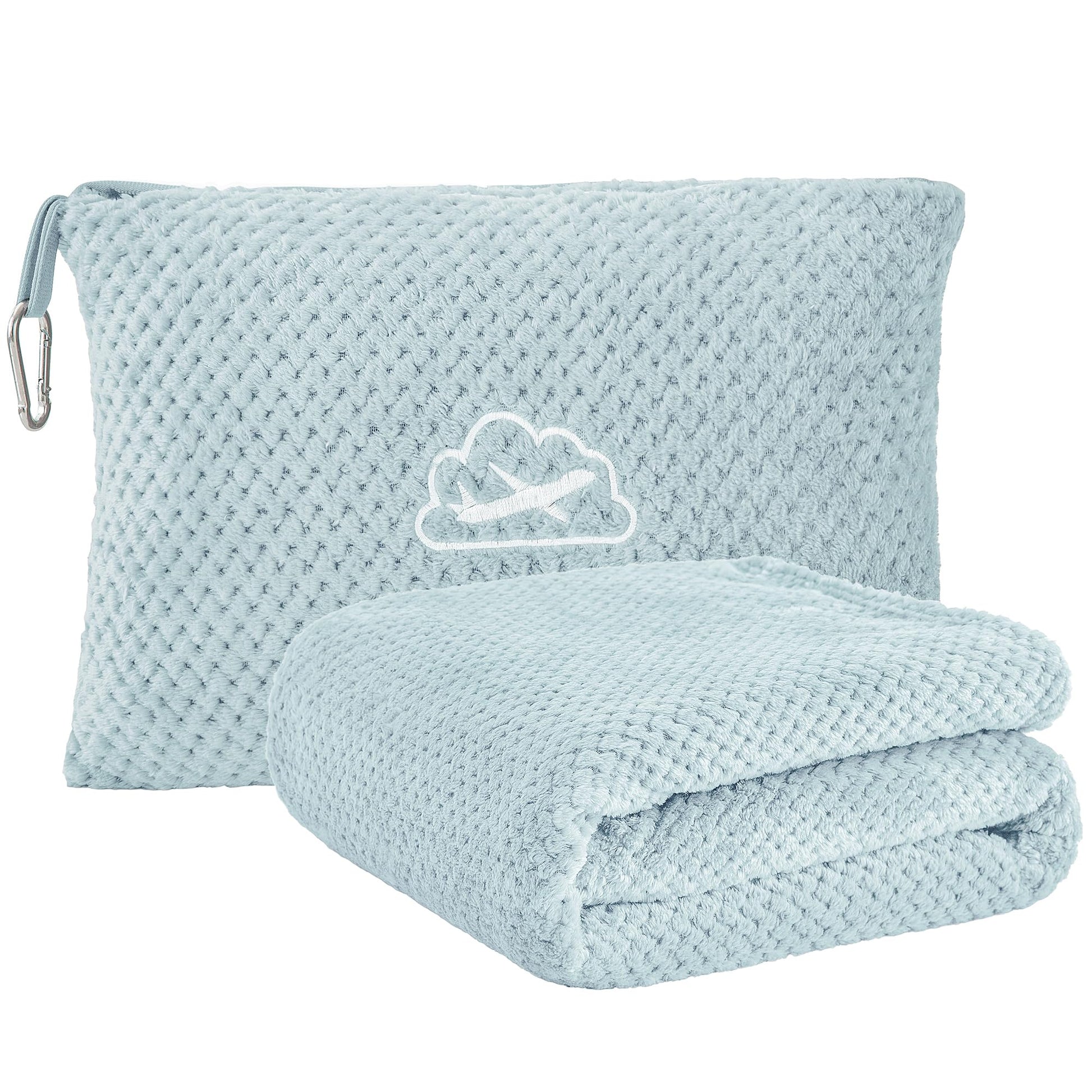 BEDELITE Travel Blanket and Pillow Set 2-in-1, Ultra-Soft Jacquard Fleece Blanket with Bag, Airplane Blanket with Luggage Sleeve & Backpack Clip Travel Essentials, Blue