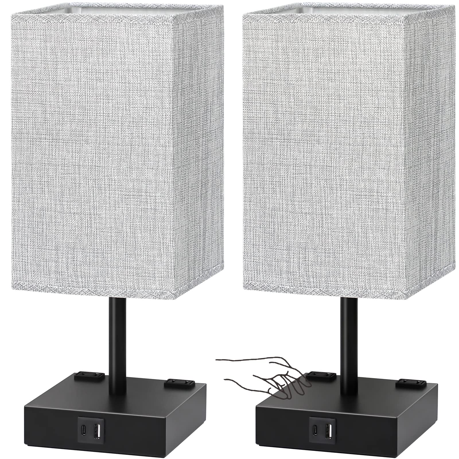 Bedside Table Lamps Set of 2 - Touch Nightstand Lamp for Bedroom with USB C+A Charging Ports & AC Outlets, 3-Way Dimmable Desk Lamp Grey Fabric Shade for Bedroom Living Room, Office(Bulb Included)