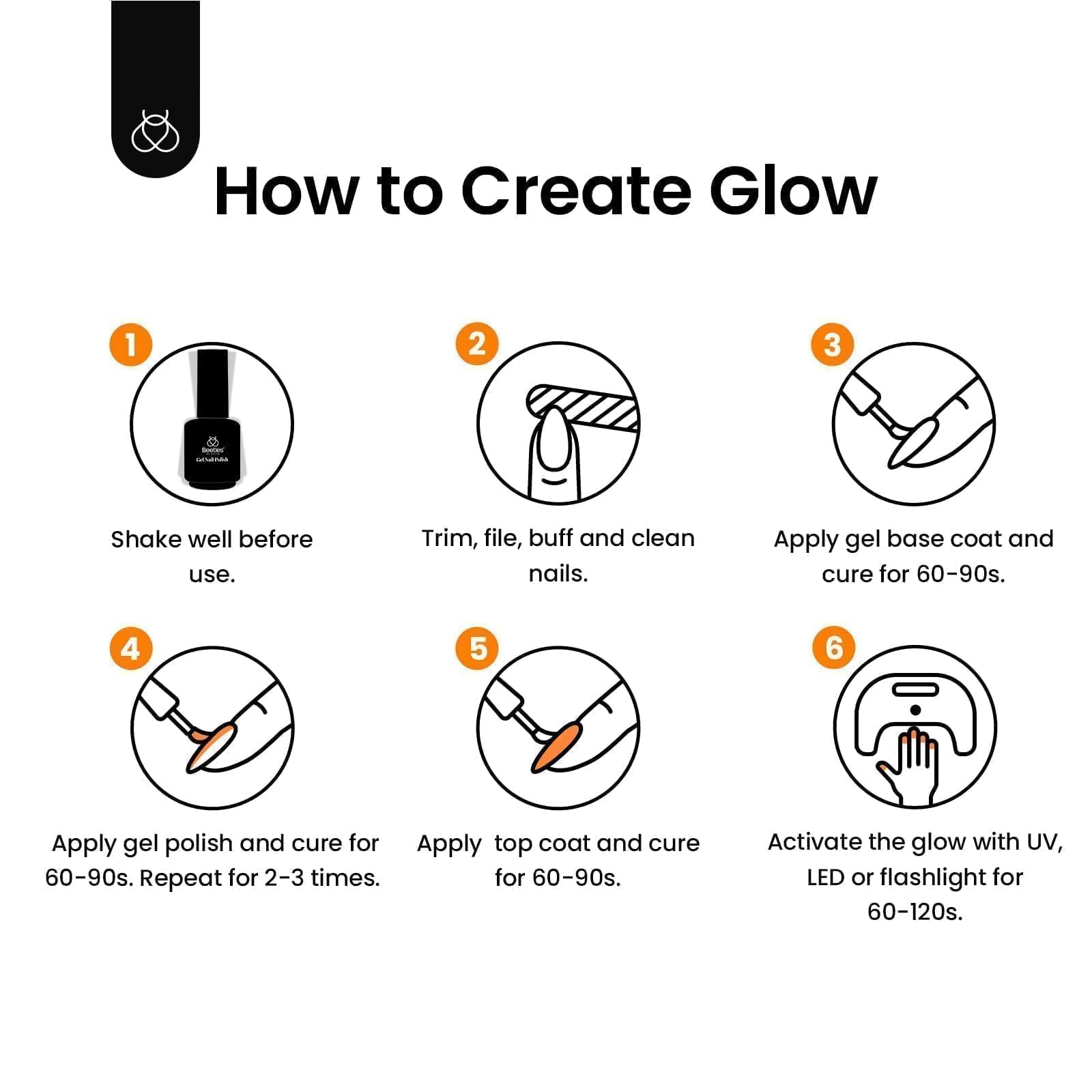• 【Product Duration and Instructions】: 1. The luminous orange effect is 5-10 minutes after the lamp is cured.2.When the fluorescent effect wears off, turn on the flashlight of your mobile phone or uv lamp for about a minute. The longer the irradiation time, the brighter it will be.The luminous powder is easy to precipitate, so please shake it up and down before use to maintain the luminous effect.