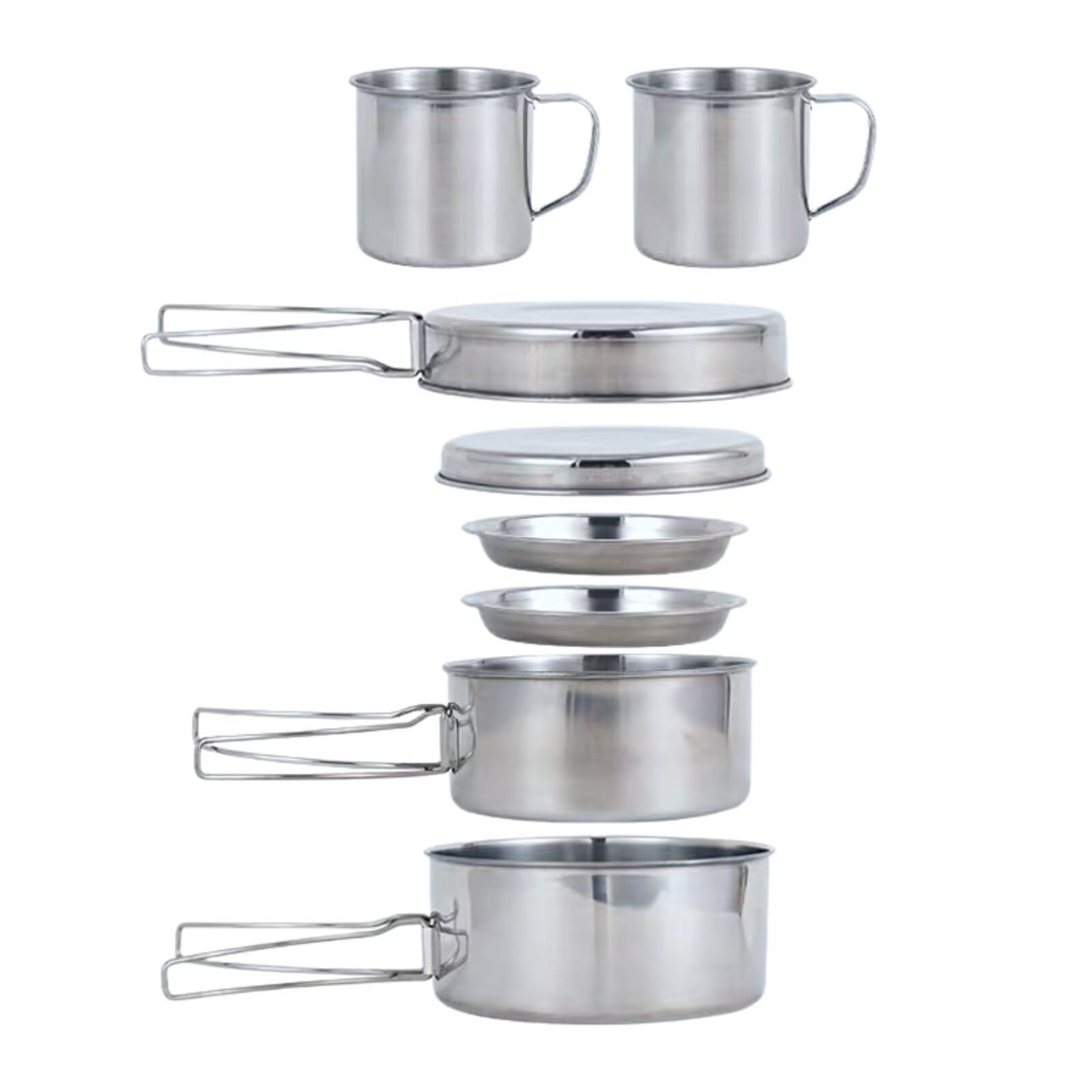 • 【Cost-effective Choice】Best money you ever spend, which surprised you for the price, 8-in-1 camp cook set.Including 2 pots, 1 frying pan, 1 plate,2 reel edge plates, and 2 cups.