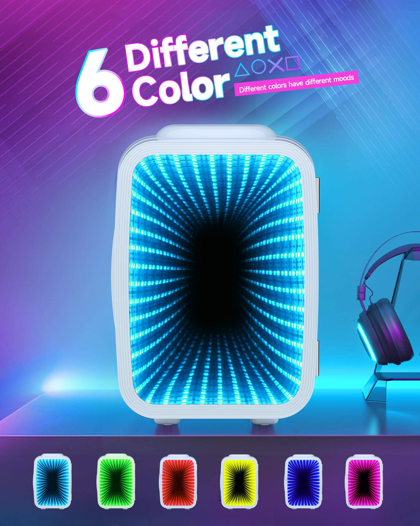 • 6-SPEED LIGHT ADJUSTMENT: Cool mini fridge Lighting can be adjusted freely,There are red, green, blue, purple, cyan, and yellow respectively,full of technological e-sports feeling,Has a nice clean look to it with sharp colored led lights, perfect for gamers or anyone who wants to add a fun touch to their space