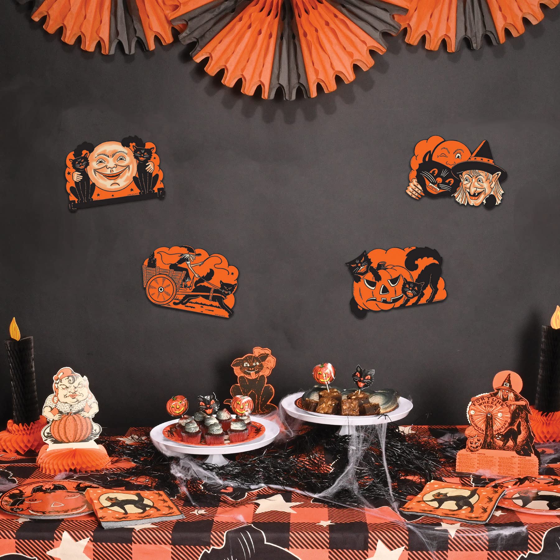 • FOUR VINTAGE HALLOWEEN CUTOUTS: Set includes four nostalgic designs featuring a witch full moon pumpkin and black cats drawn from classic Beistle illustrations