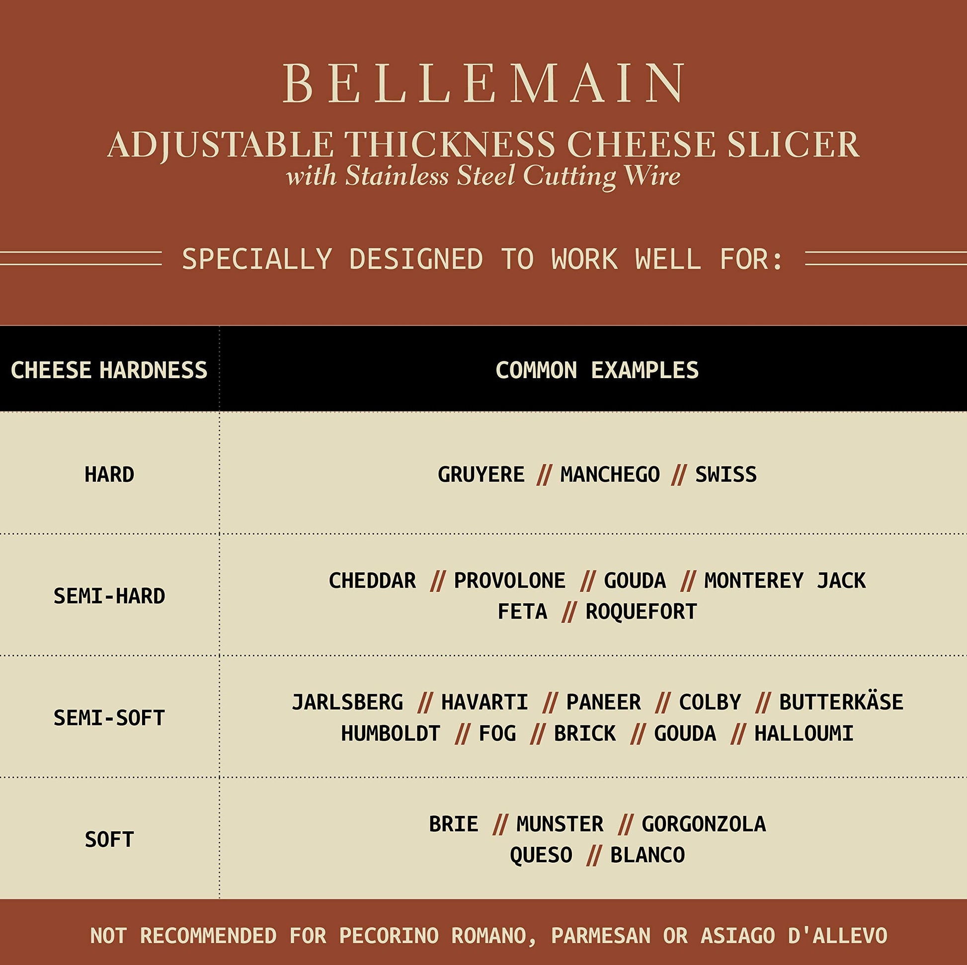 • THE ADJUSTABLE WIRE CUTTER DELIVERS CONTROL INTO YOUR HANDS: Rugged stainless steel wire cuts beautiful slices to the perfect thickness. Thick, thin or even paper-thin slices - it’s up to you. The Bellemain Cheese Slicer lets you have it your way.