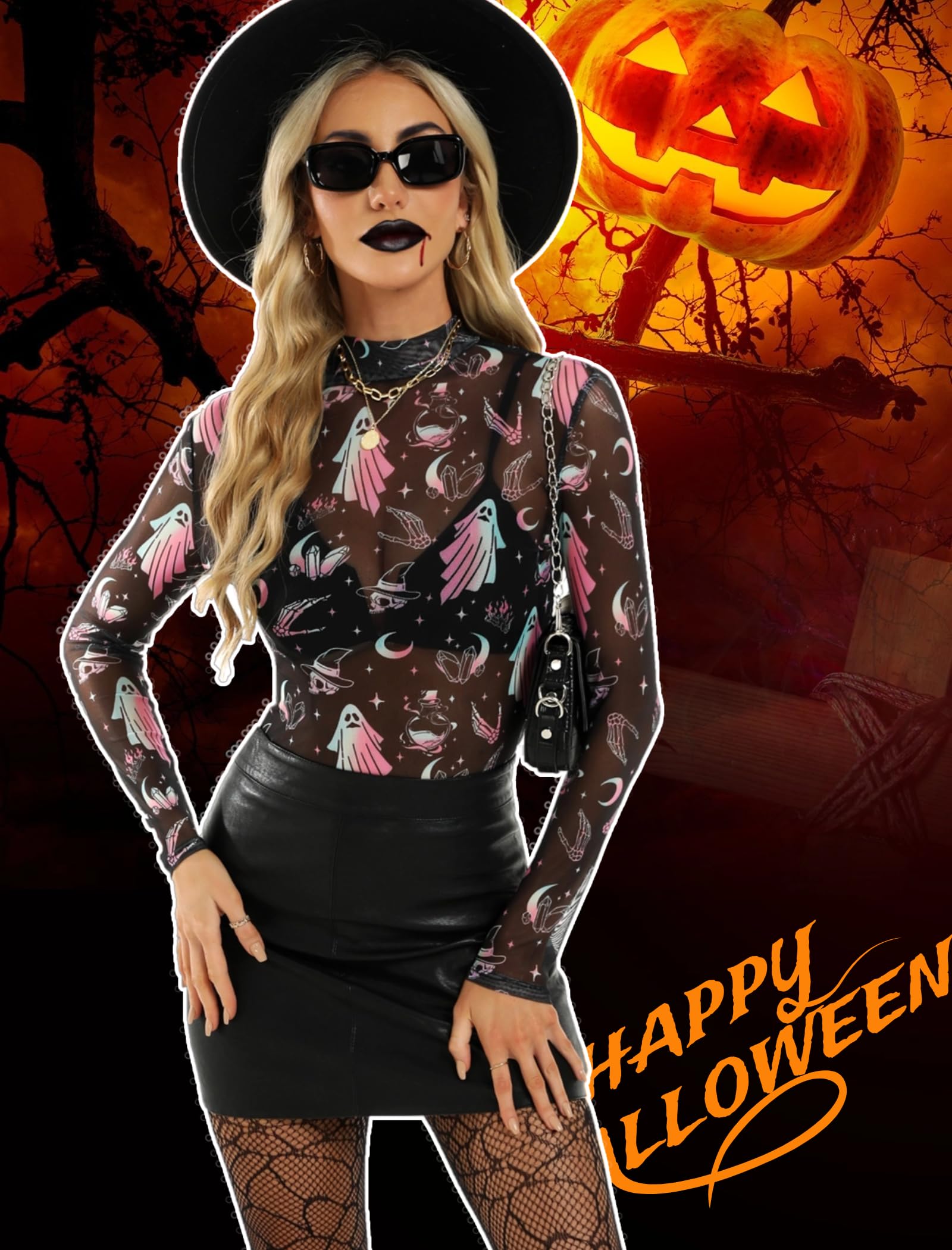 BemorRun Floral Mesh Long Sleeve Tops for Women Mock Neck See Through Fitted Sexy Going Out Top(Black Pink Specter,XL)