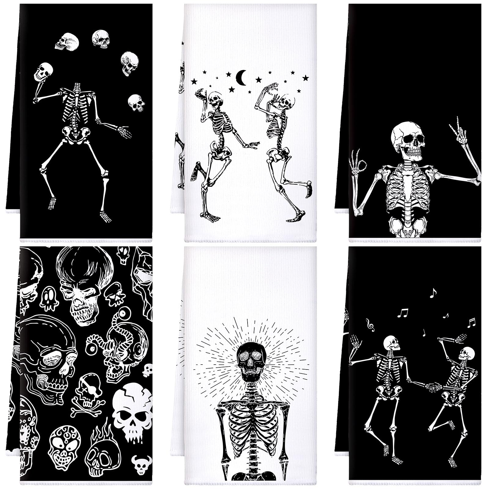 • Skull Hand Towels: there are 6 pieces of skeleton kitchen towels, coming with 6 different patterns, which are beautiful and delicate, can meet your daily using demands, and you can change easily, can serve you for a long time
