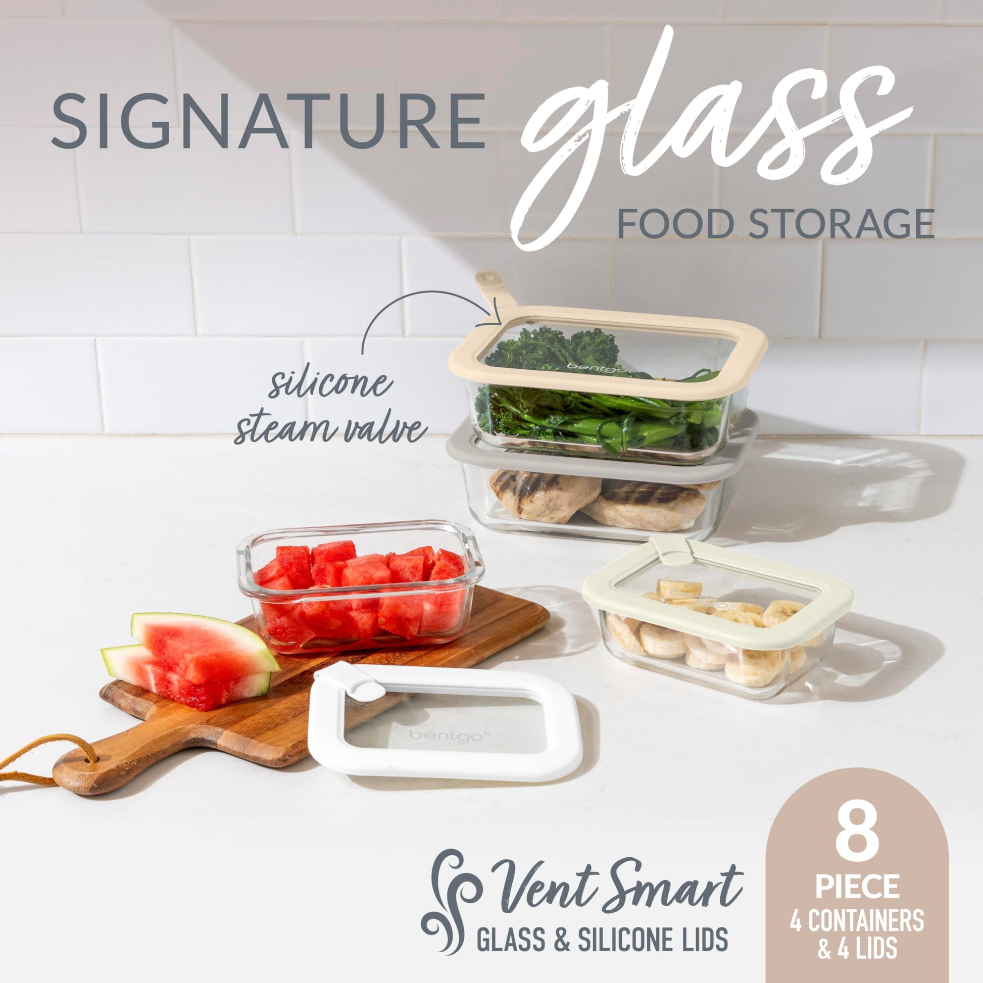 Bentgo Signature Leak-Proof Glass Food Storage - 8-Piece Set, 1-Compartment Plastic-Free Containers with Airtight Glass Lids, BPA-Free, Microwave, Freezer, Oven & Dishwasher Safe (White Stone)