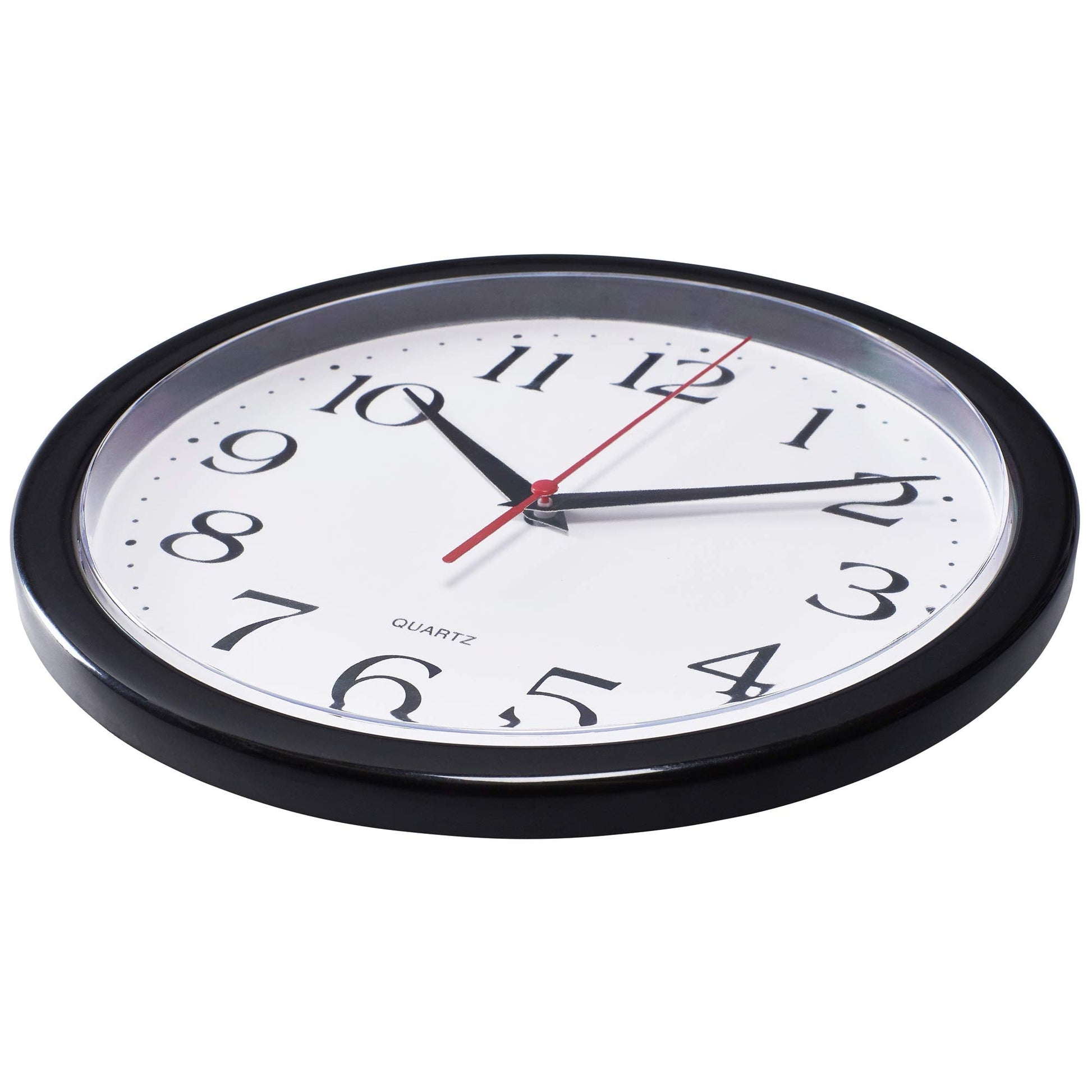 • 10 Inch clock. Large black bold numbers against white face background creates easy viewing. Precise Quartz movements guarantee accurate time