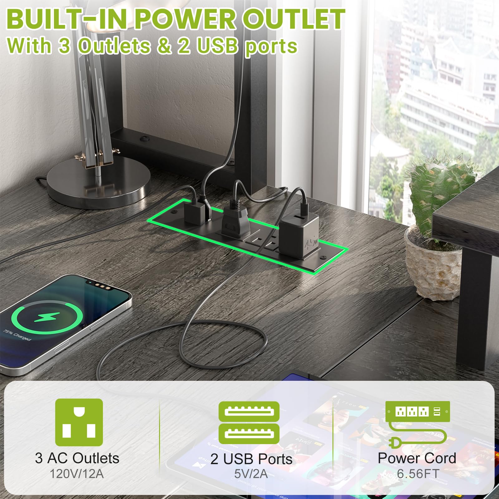 • 【Home Office Desk with Charging Port】Our computer desk features charging station includes 3-AC outlets & 2 USB ports, bringing great convenience to users for gaming or home office working. Easily charge your computer, smart phone, ps4, power bank or gaming gear. Rated Power: 1500W; AC Outlet: 120V/12A; USB Port: 5V 2.2A; power cord long: 6.5ft