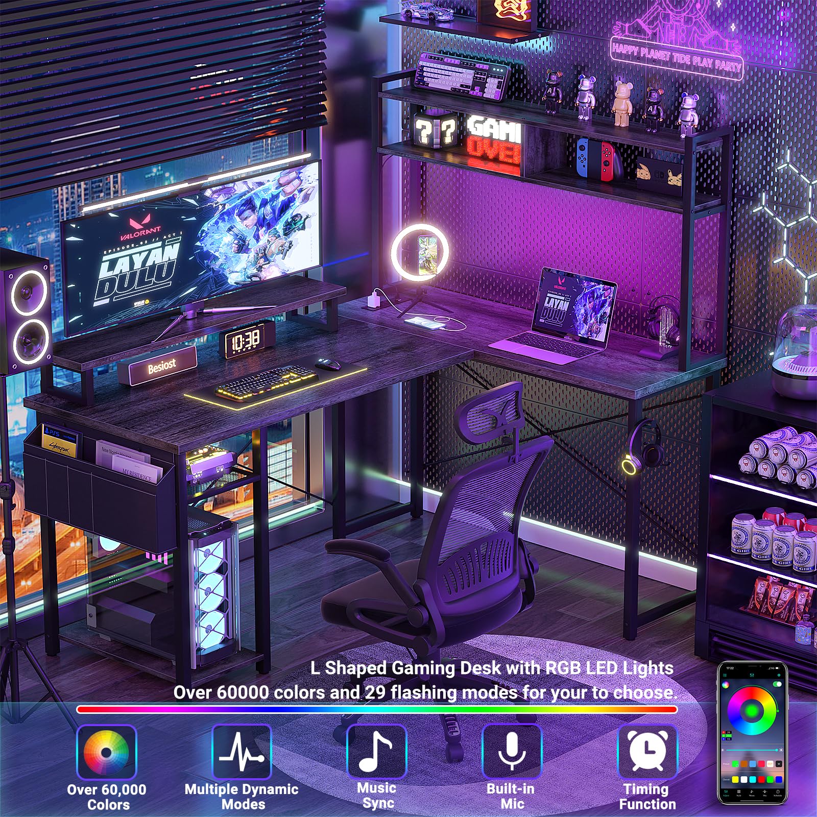 • 【L Gaming DESK with Smart LED Lights】This modern l shaped desk perfect for small spaces features an RGB light strip under the hutch for colorful. and Over 60000 colors and multiple flashing modes for your to choose. Led lights built-in music sync function can change the lights color with the rhythm of the sound and music. Try DIY your room and add an immersive game.