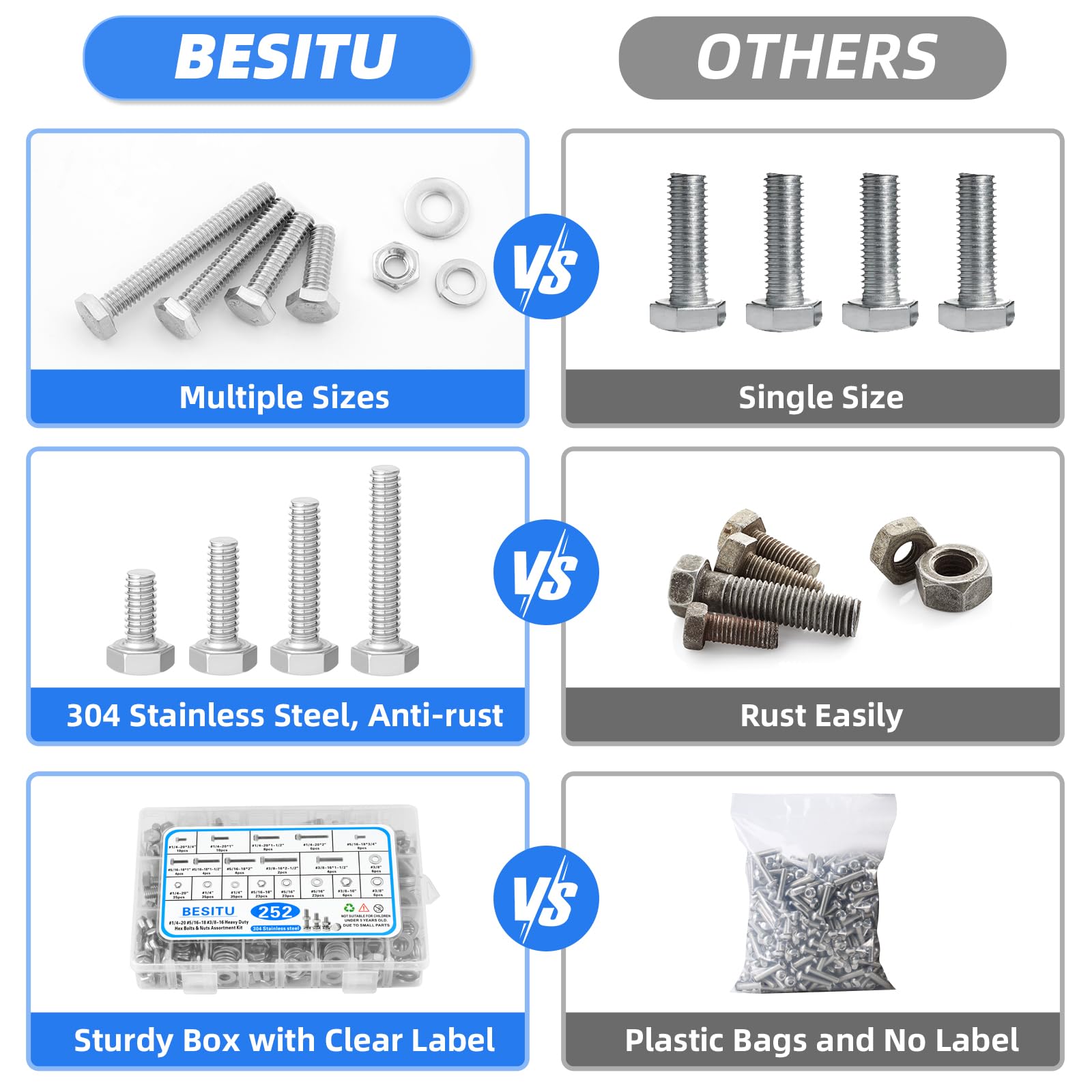 Besitu 252Pcs Hex Bolts and Nuts Assortment Kit, 1/4-20, 5/16-18, 3/8-16 Assorted Bolts Nuts and Washers Kit, 304 Stainless Steel Machine Screw Sets with Case