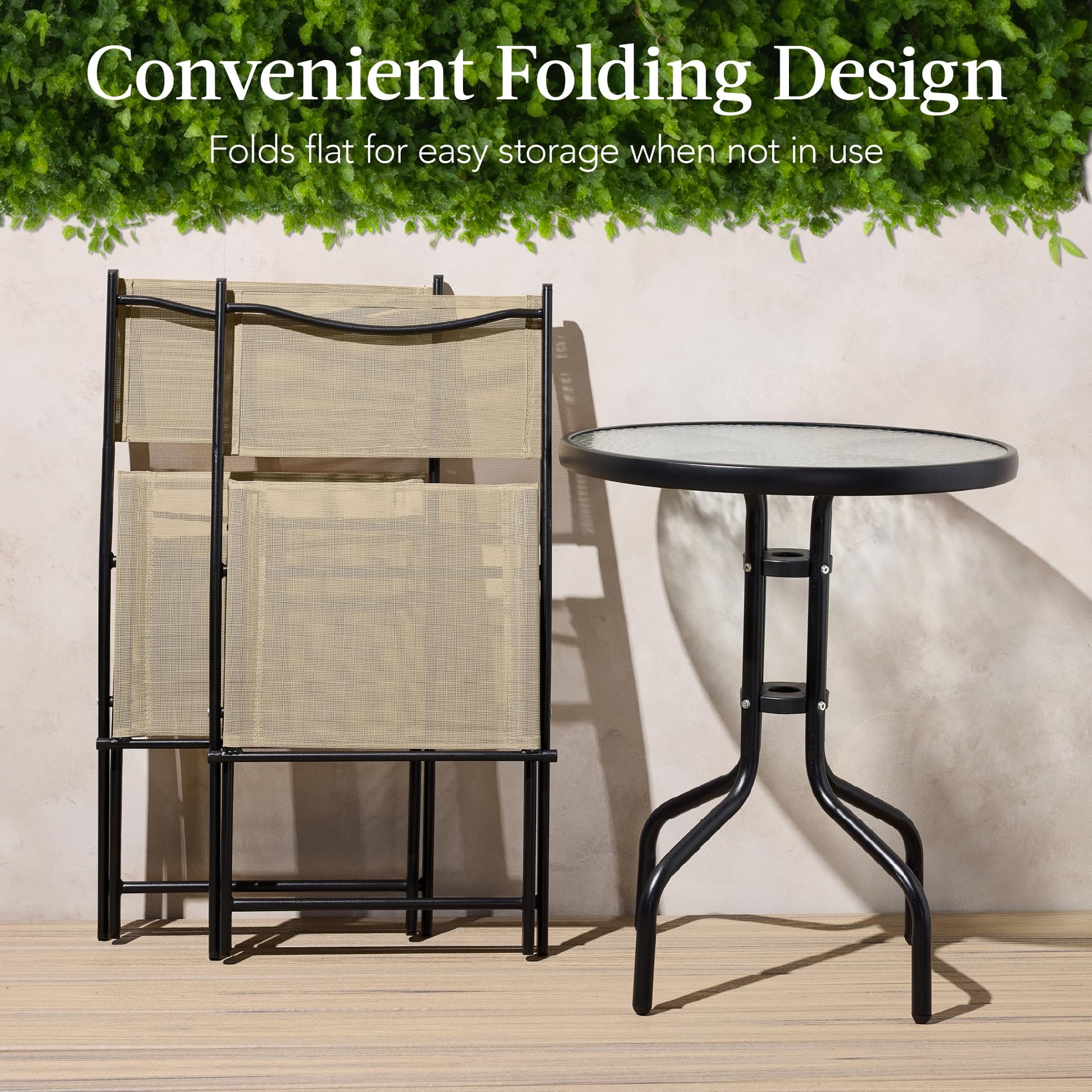 Best Choice Products 3-Piece Patio Bistro Dining Furniture Set w/Textured Glass Tabletop, 2 Steel Folding Chairs, Polyester Fabric - Beige