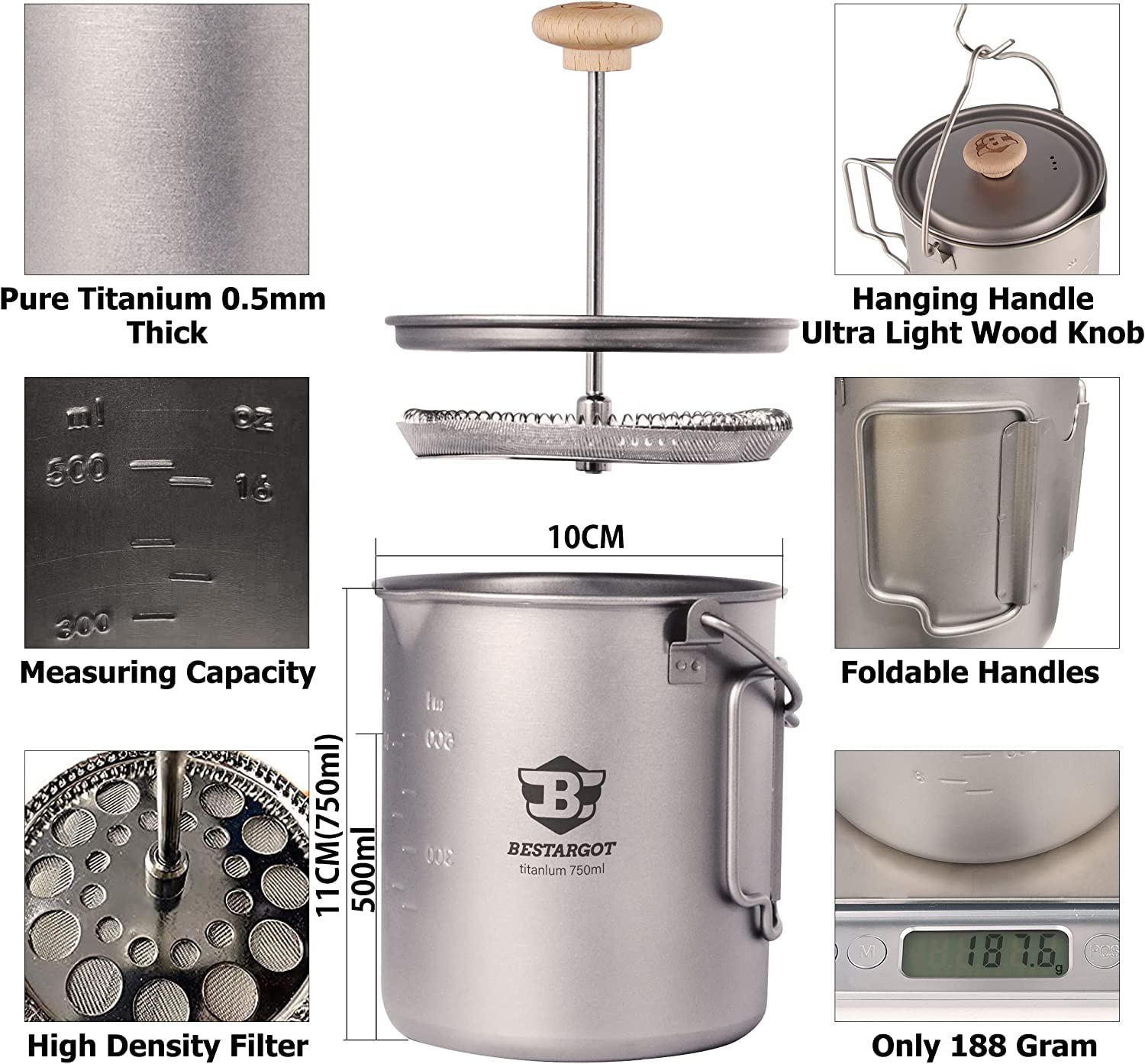 Bestargot Titanium Pot 750ml, Portable French Press | Ultralight Camping Pot for Coffee, Cooking & Survival | Compatible with Camp Stoves