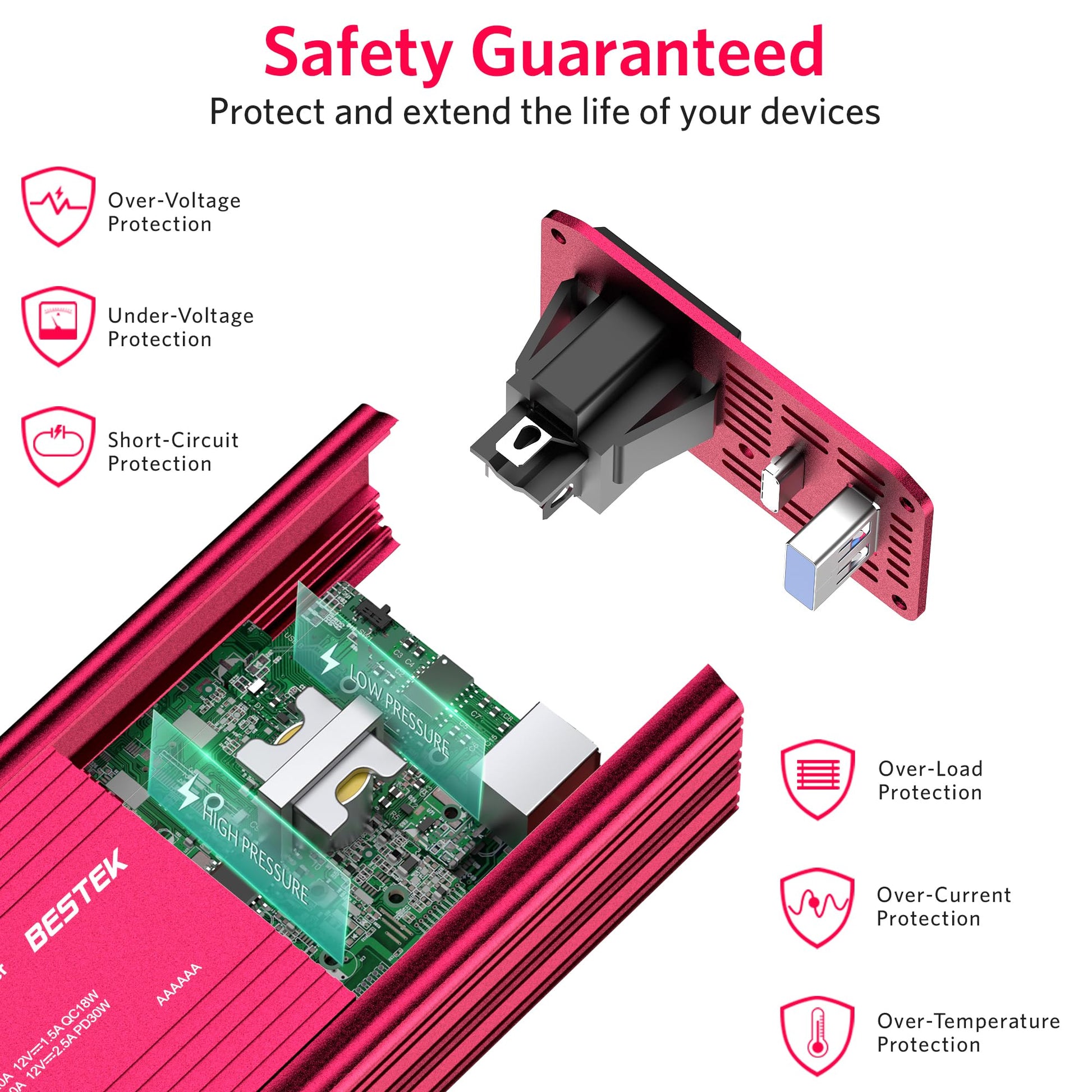 • BESTEK ADVANTAGE: America's leading power inverter brand. Provides 200 Watts continuous DC 12v to AC 110v power inverter featuring PD 20W&QC 18W USB ports, 1 AC outlet, and a 24-inch cable with cigarette lighter plug.