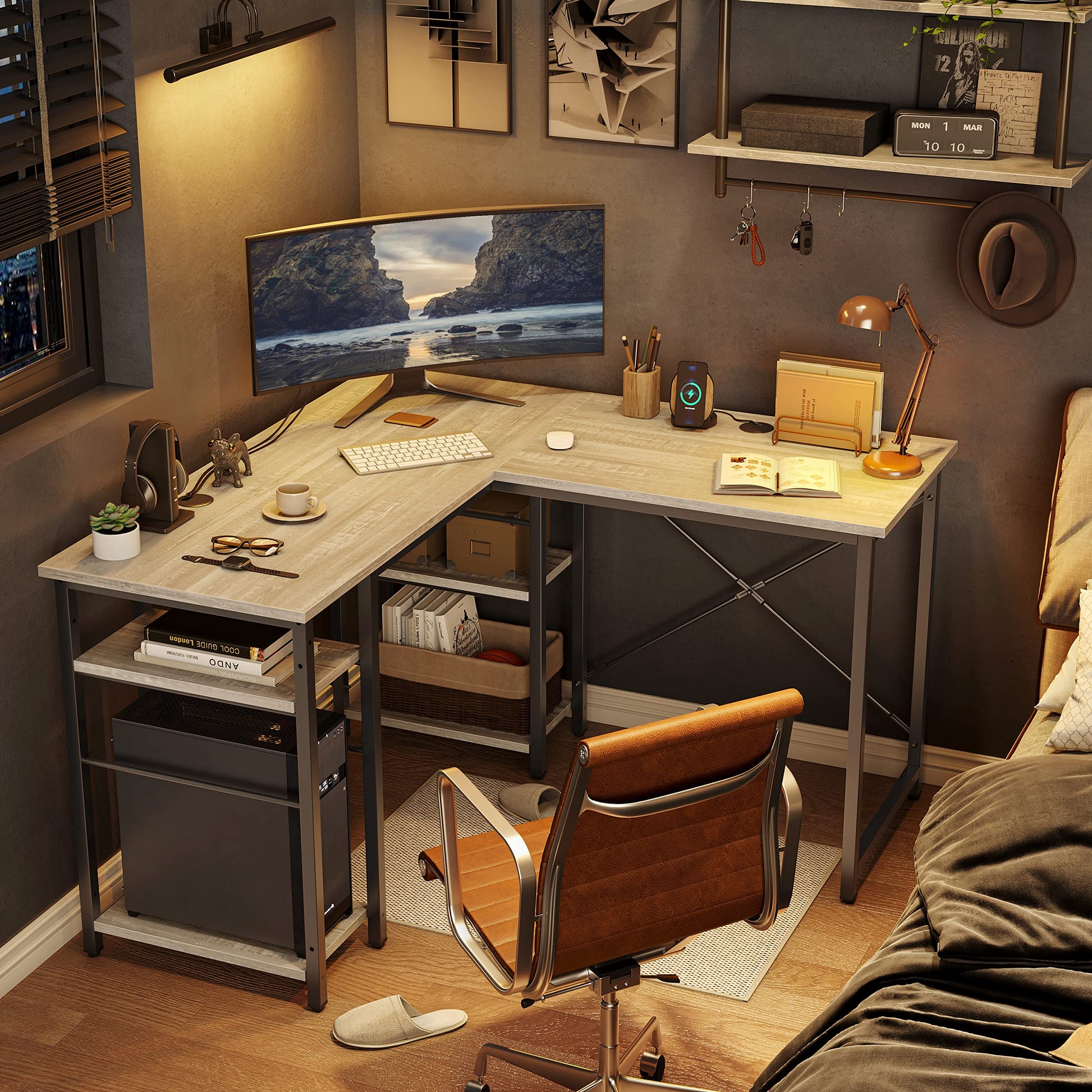 • Flexible Storage Shelves: The shelves under desk can be installed at Right + Middle or Left + Middle when becoming an l-shaped desk; also can be Right + Middle when a long straight desk
