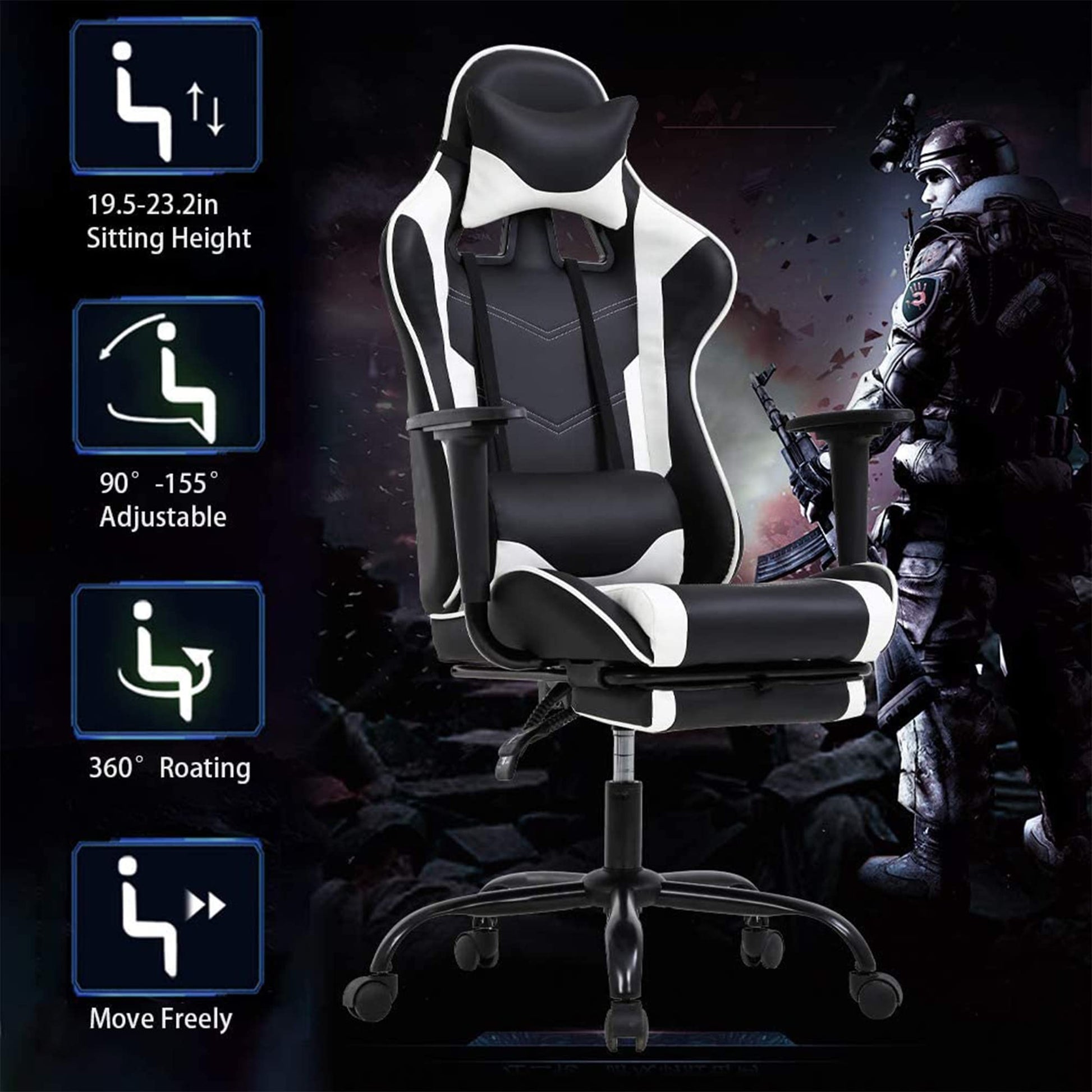 • COMFORT FROM EVERY ANGLE - Our brand-new ergonomic racing chair is thickly cushioned for maximum comfort, whether you’re spending long hours at the office, in front of the computer, or gaming. Covered with breathable premium PU leather, the chair is equipped with freely adjustable lumbar support and a headrest pillow to protect your spine and neck, while the adjustable reclining feature allows users to lock in any reclining position, from 90-155°.