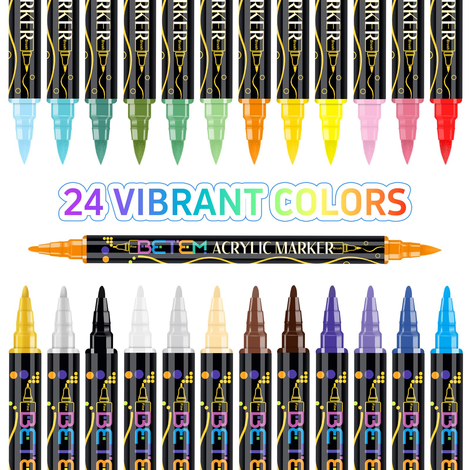 Betem Acrylic Paint Markers, Dual Tip 24 Colors Acrylic Paint Pens with Brush Tip and Fine Point, Art Supplies for Rock, Wood, Canvas, Stone, Glass, Ceramic, Rock Painting DIY Crafts Making Drawing