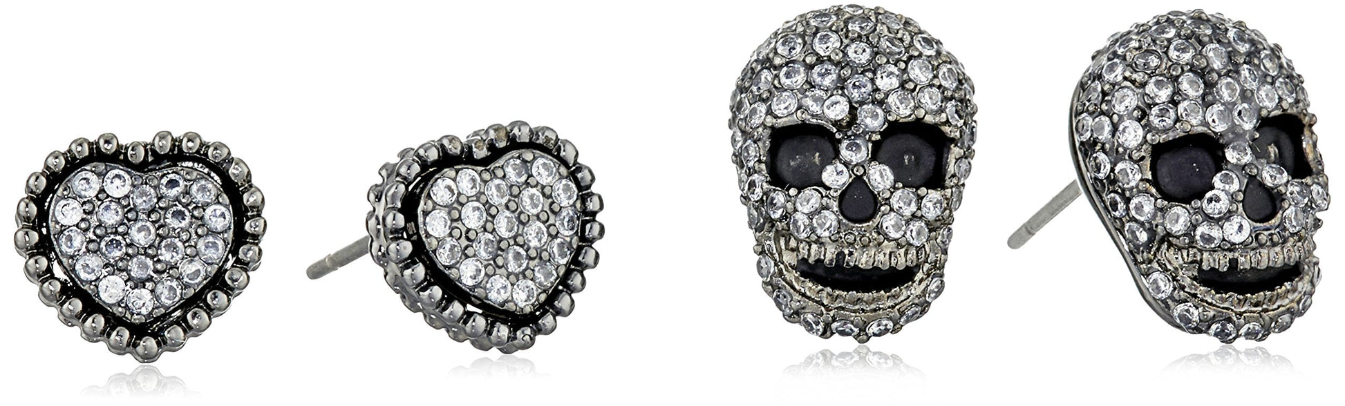 Betsey Johnson lovely heart and sleek skull duo stud earring set embellished with delicate pave stone accents. Earrings set includes 2 pairs of studs, set in hematite-tone metal with a post back closure.