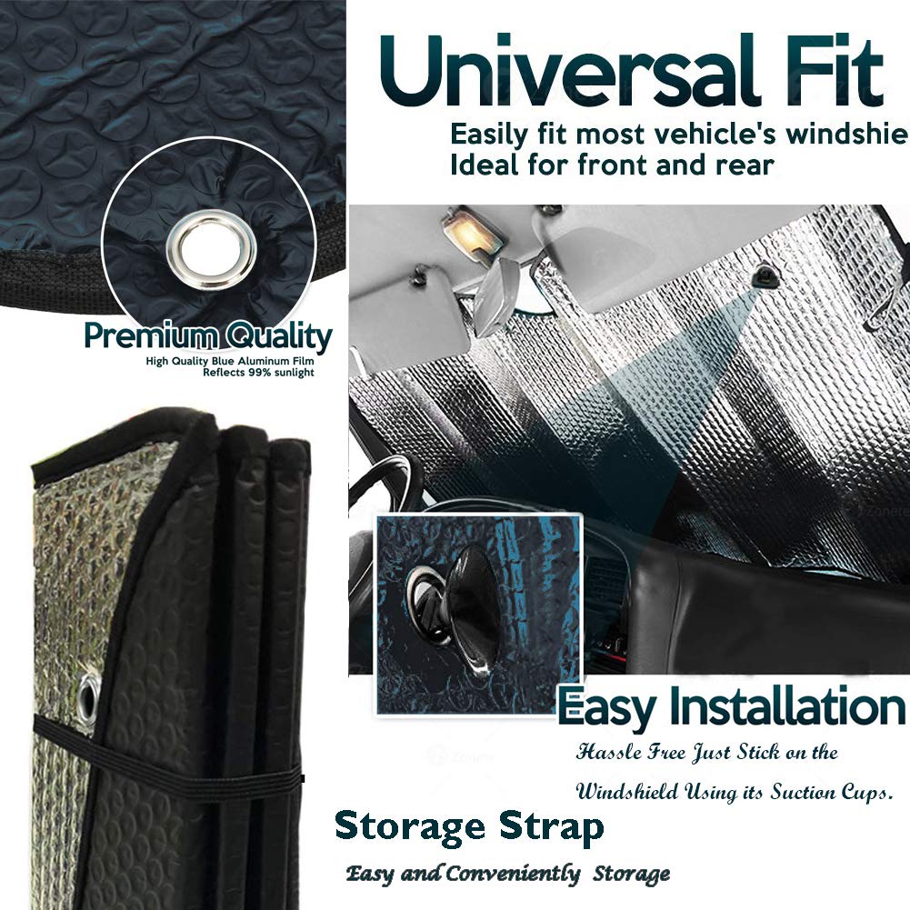 • EASY TO SETUP AND CARRY - The car windshield sunshade comes with suction cups that quickly attach to the windshield and the side window.Simply stick the easy to use suction cups onto the desired window and watch the magic happen. The suction cups can also be removed easily when not in use.fold-able shades quickly and easily fold away into the pouch provided for convenient placement inside your vehicle.