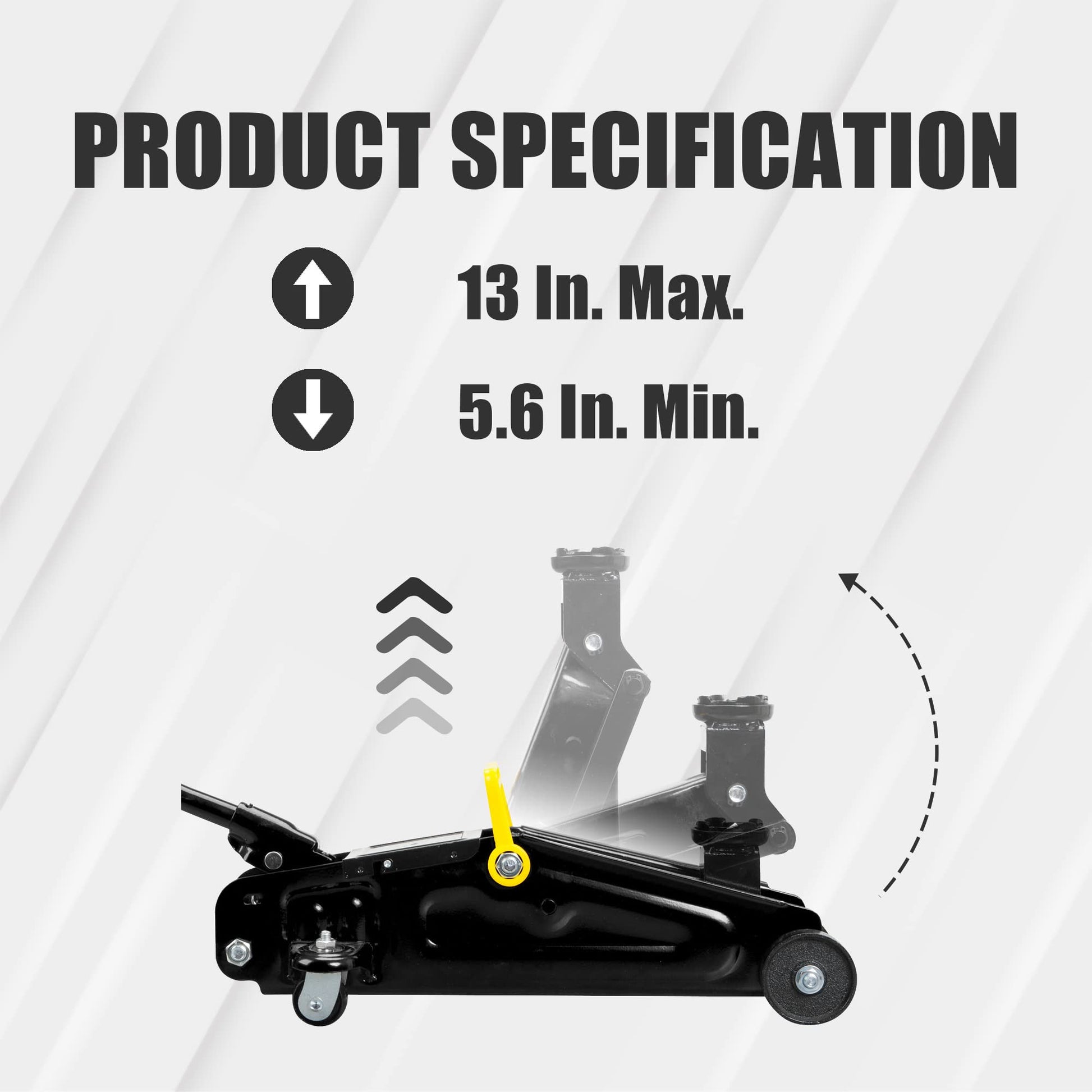Details: The Torin BIG RED AT820014SB hydraulic trolley floor black jack is constructed with heavy duty steel, providing long term durability with an industrial luster. This floor jack has a 1.5 ton (3,000 lbs) capacity and features a minimum lifting height of 5-3/5' and a maximum height of 13', which is ideal for most cars, trucks, and SUVs. A safety bypass system prevents over-loading and ensures safe operation. Equipped with (2) large steel casters and (2) 360-degree swivel casters for smooth maneuverability. The Torin BIG RED AT820014SB hydraulic trolley floor black jack is equipped with a handle for quick portability. It includes a plastic blow mold carrying case for easy storage when not in use. IMPORTANT: Before first use on any lift, verify that a daily inspection has been completed and that all components are in the proper working order.