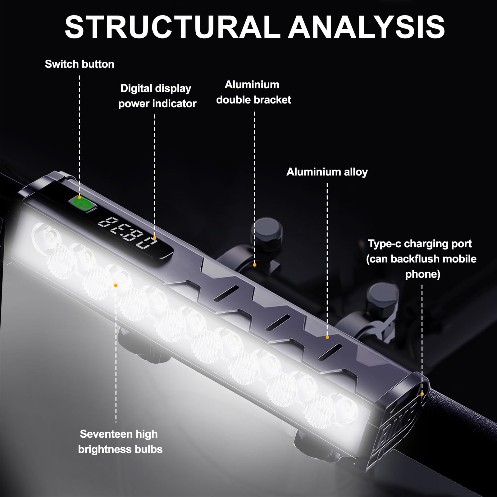 • 【Super Bright & Long Runtime:】 Our bike light features 17 LEDS, providing 4800 brightness. In high beam mode, it can reach an impressive range of 2624 feet. It has a high capacity of battery and provides 9 hours of run time for night riding, road cycling and mountain biking.