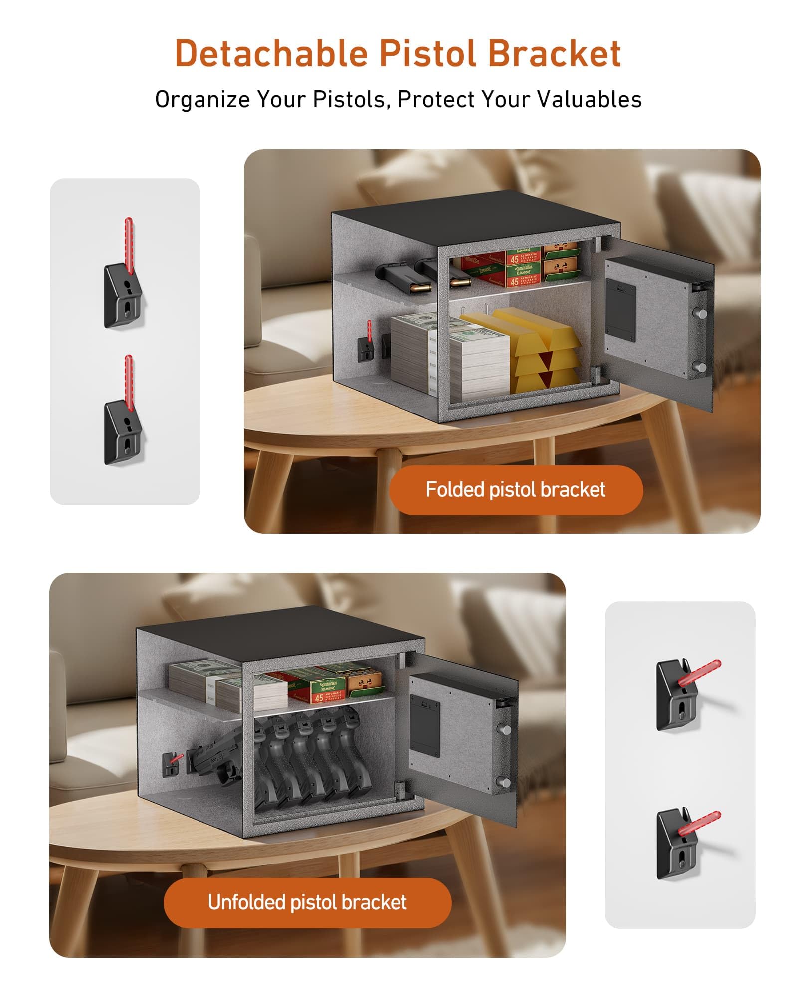 • Unique Pistol Bracket Design: This fingerprint gun safe can easily store 6 pistols and other precious items. You can scientifically and safely to store your pistols, protect your children,The support bar which holds guns can be unscrewed and put to the hole at the side of the pistol bracket base to save space
