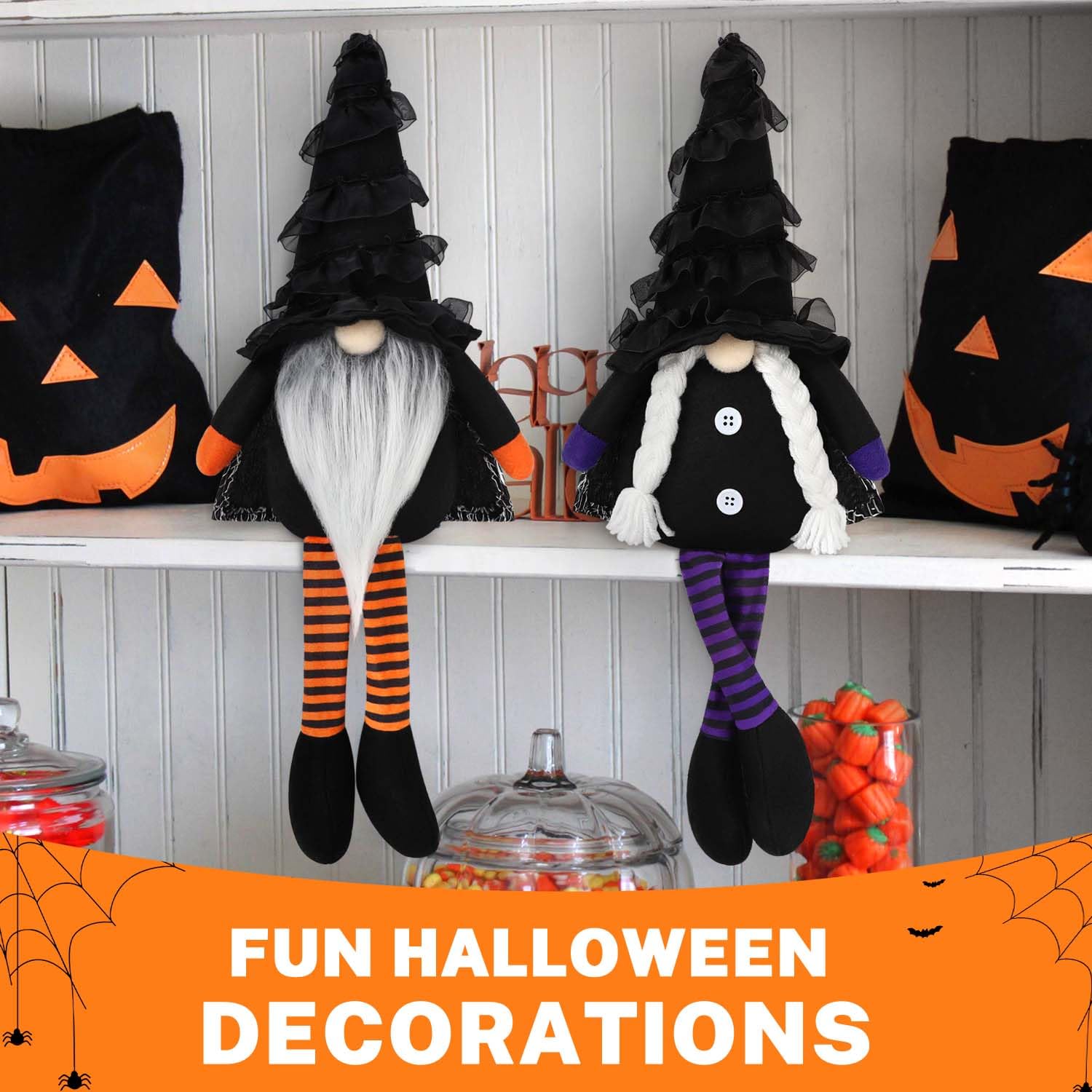 BINSUNS Halloween Plush Gnomes Decoration, 2 Pack Halloween Dangle Leg Gnomes Doll Elf Dwarf - Black Witch Cloak Hat Stuffed gnomesfor Halloween Home Decor Table Decorations Gifts Household Ornaments