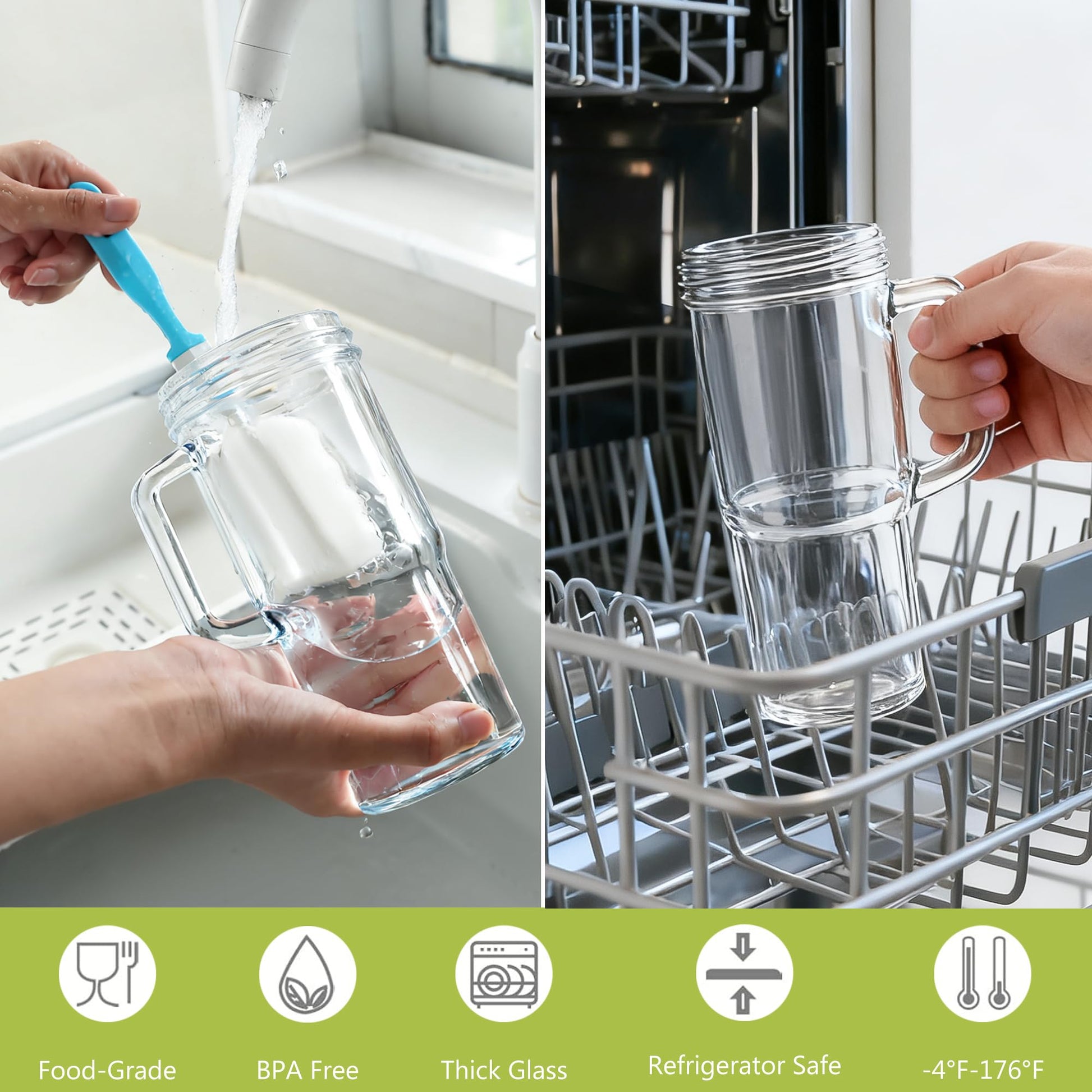 • SAFE MATERIAL & EASY TO CLEAN: The 24oz glass tumbler with handle made of premium thickened glass, food grade natural bamboo lid, and 304 stainless steel straw, BPA free, more sturdy and durable, dishwasher safe, this reusable boba cup features a wide mouth Designed with straw brush and cup brush, it is very easy to clean and looks stylish and sophisticated.