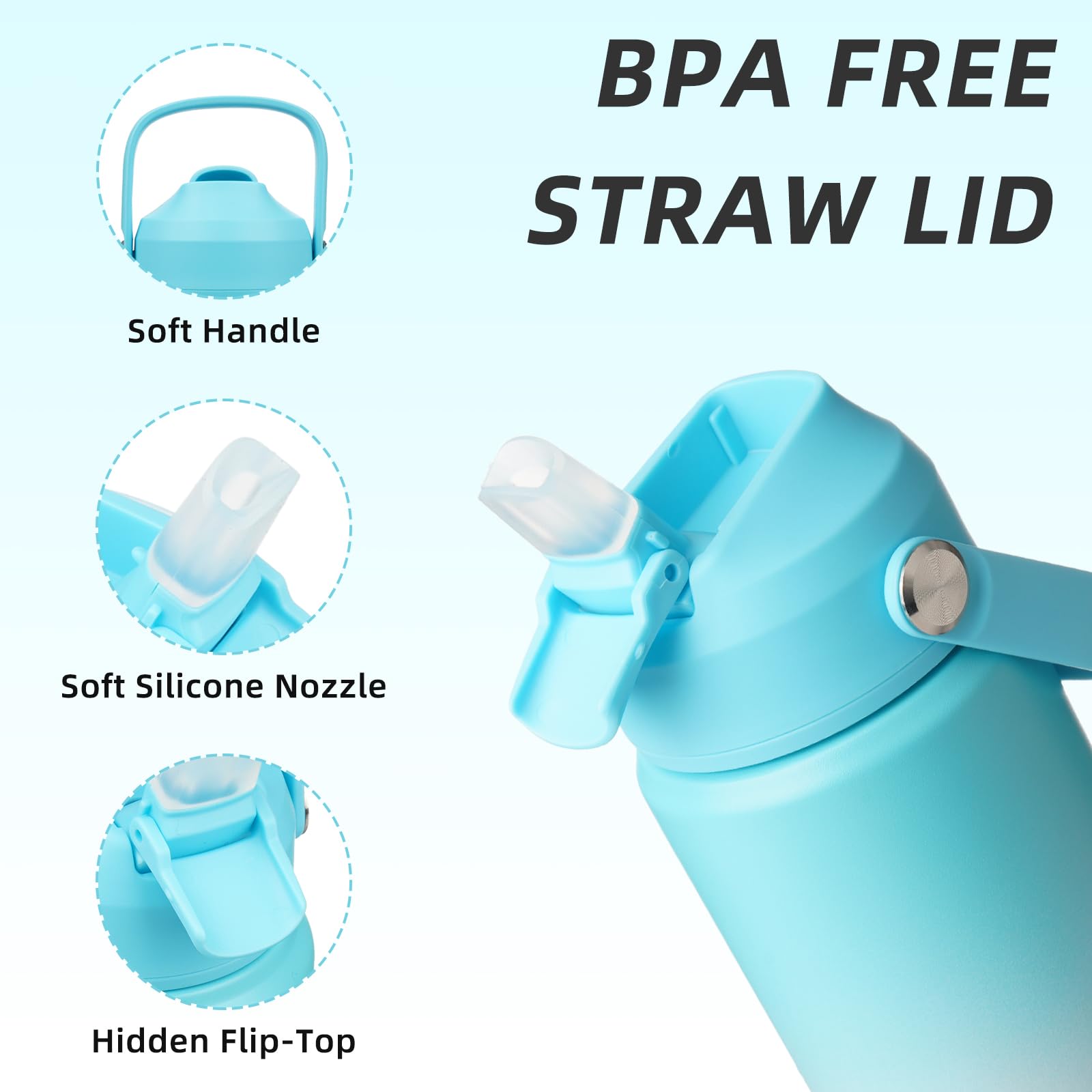 • INSULATED WATER BOTTLE WITH UPGRADED STRAW LID: BJPKPK insulated water bottle with straw lid use hidden flip-top Straw Lid to ensure open and close easily with one hand. The handle is soft and can freely rotate 180° for effortless carrying. Soft silicone nozzle will give you a better drinking experience. Upgraded hidden nozzle design can also keep the nozzle clean and ensure leakproof when it closed