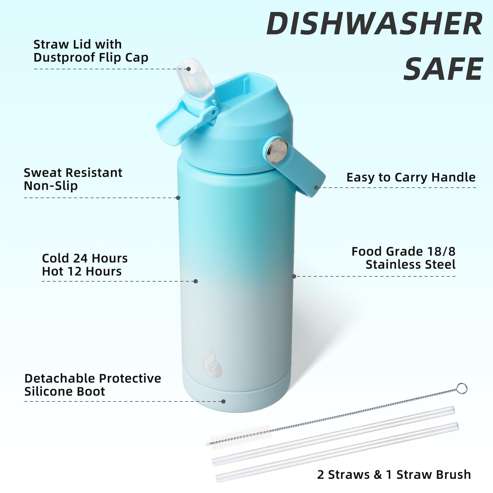 • NON-SLIP PROTECTIVE BOOT & DISHWASHER SAFE: This stainless steel water bottle comes with a detachable silicone boot to protect the bottom from bump damage. The wide mouth design of our water cup allows for easy filling, pouring, and cleaning. With 2 straws and 1 straw brush, you can easily clean the nozzle and straw with straw brush. It is also dishwasher safe, saving you time and effort in maintaining its cleanliness and hygiene