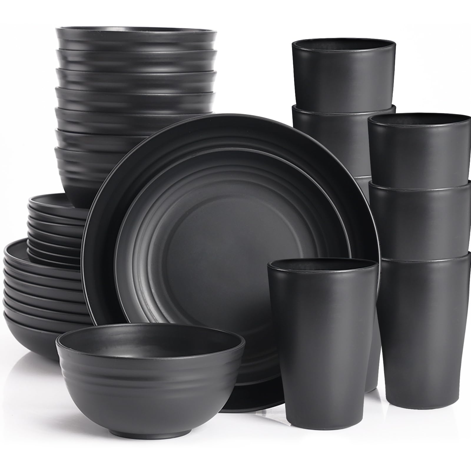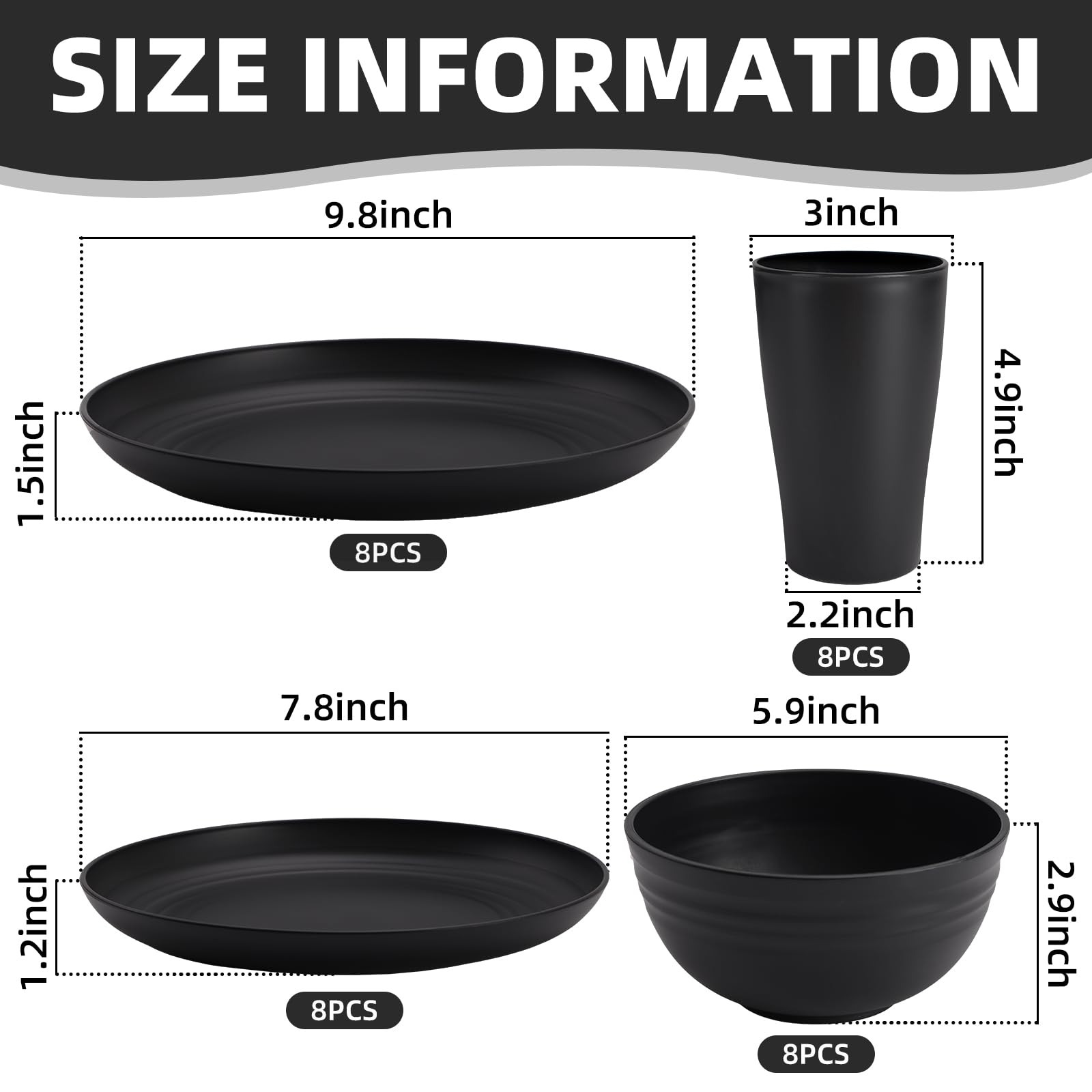• 【Wheat Straw Plates and Bowls Sets】Black plates and bowls sets for 8 is made from wheat straw and food grade PP, which is BPA-free and odorless, safe and healthy for us to use.Unbreakable plates and bowls sets is a good option instead of the porcelain or ceramic tableware for our family, as sturdy and lightweight enough for us.
