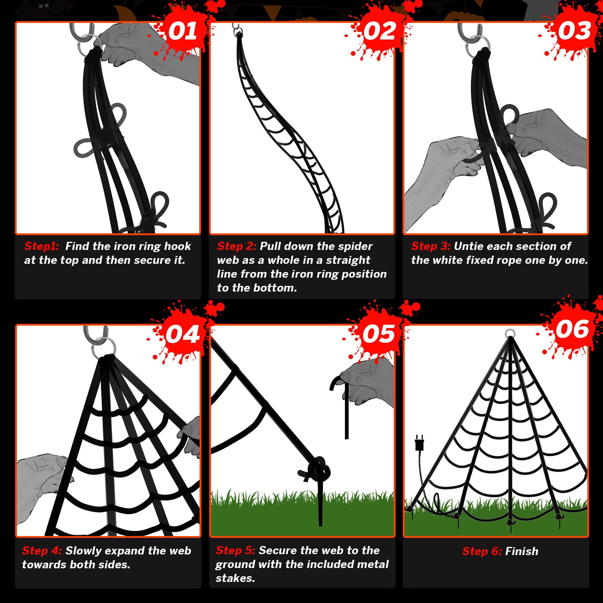 • Wide Application Range: Whether day or night, our giant spider web lights can stand out and attract the attention of neighbors. It built with 26ft long electrical cord at the base allowing you to put at anywhere easily. The fixed ring at the top and 5 ground stakes which can be directly inserted into the ground to fixed the web for camping, courtyard, garden, porch, Haunted House, outdoor Halloween Decorations, etc.