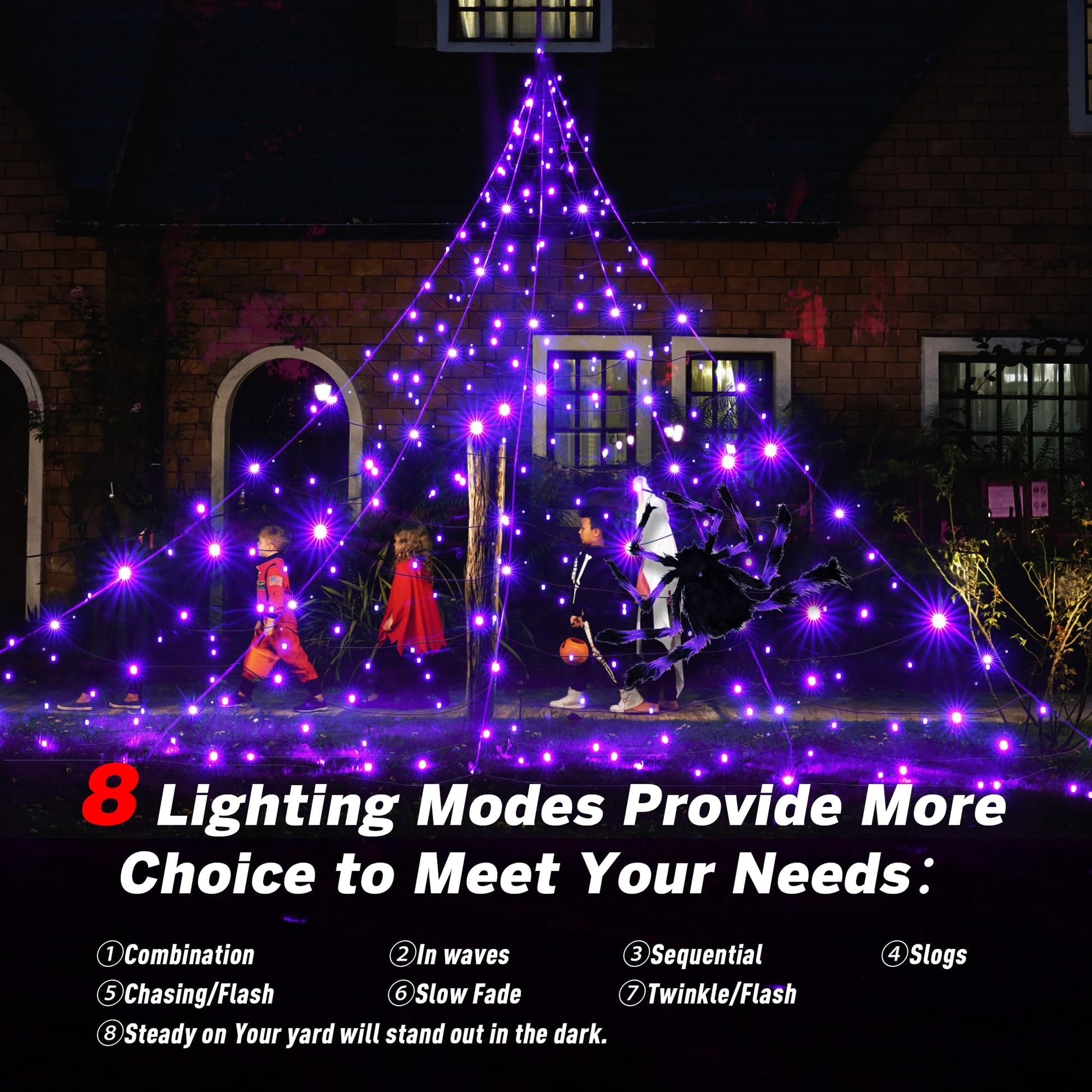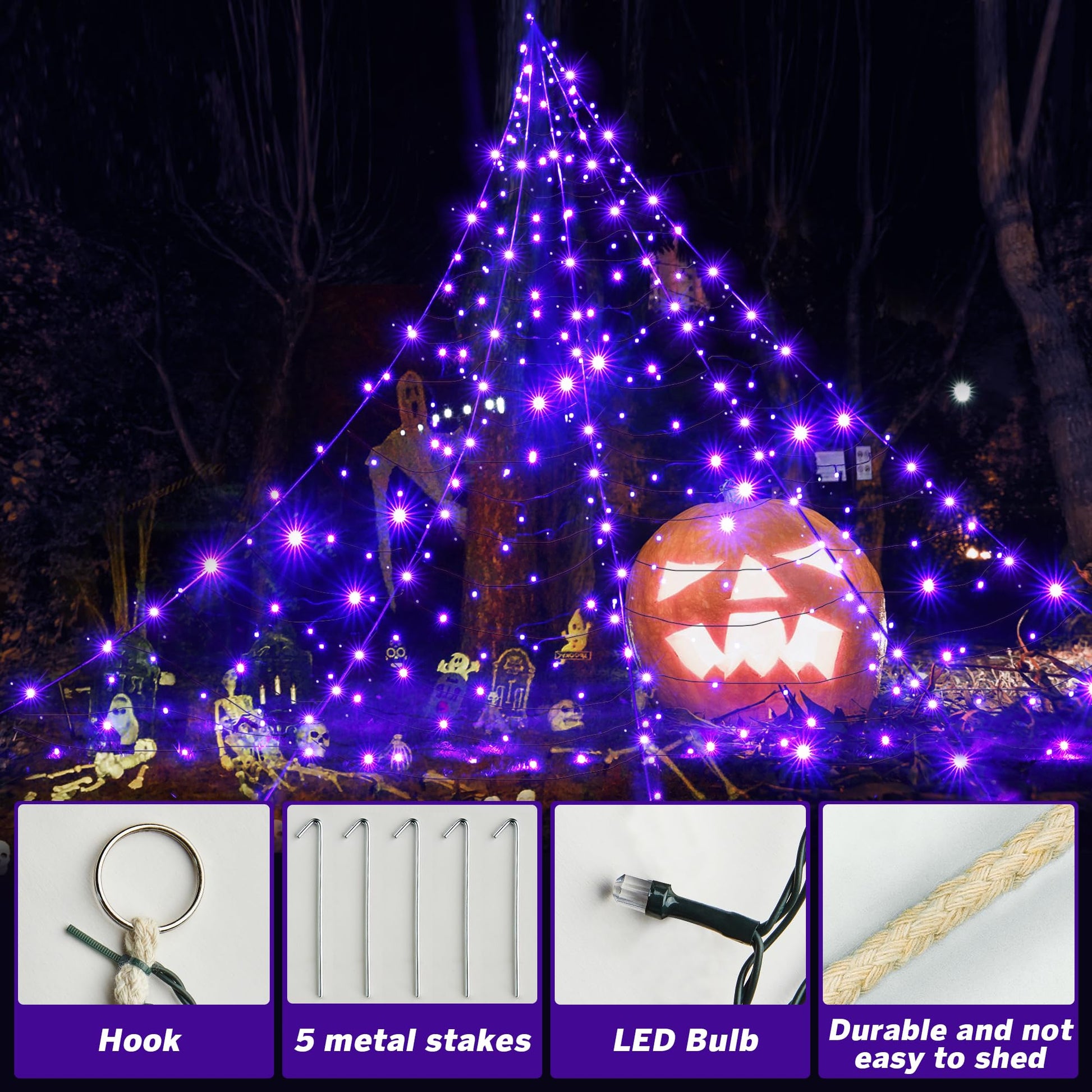 • More Durable and More LED Lights: Our Halloween Triangular web lights are made of thicker and stronger mesh material to ensure that it won't broke apart even if you place big spiders on it. They are built to last longer than others. The spider web has total 250 Purple LED lights, making it brighter and more obvious. Your yard will stand out in the dark.