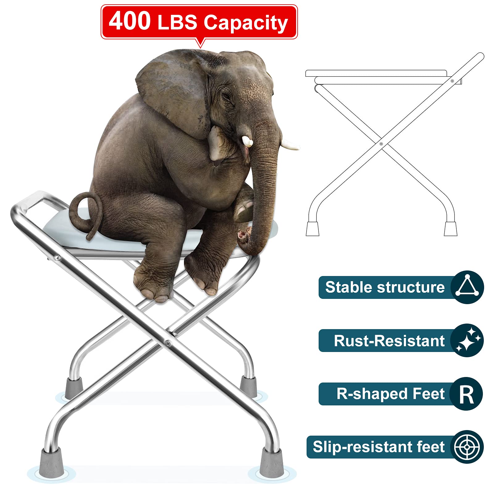 • SUITABLE FOR ALL AGES: It only weighs 4.9 pounds and has a stainless steel frame, rust resistance and durability. With its capacity to hold weight up to 400 lbs, this portable toilet seat is suitable for various ages.