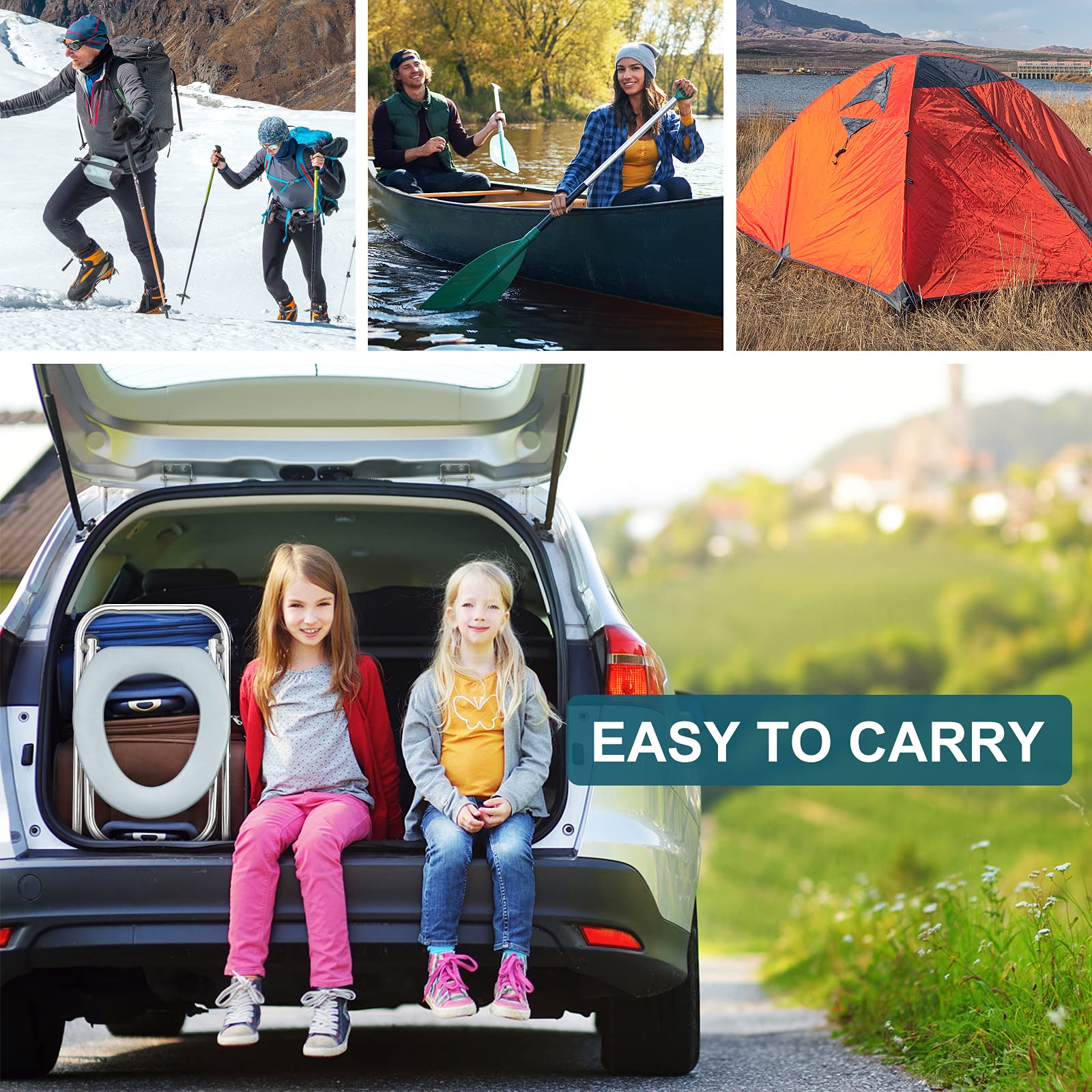 • PORTABLE & EASY TO CARRY: Portable toilet seat is designed to be both portable and lightweight. This toilet seat can be folded and fit into your car’s storage or compartment and be rrought during long Car Trips, beach nights, and camping. It takes up minimal space in the storage.